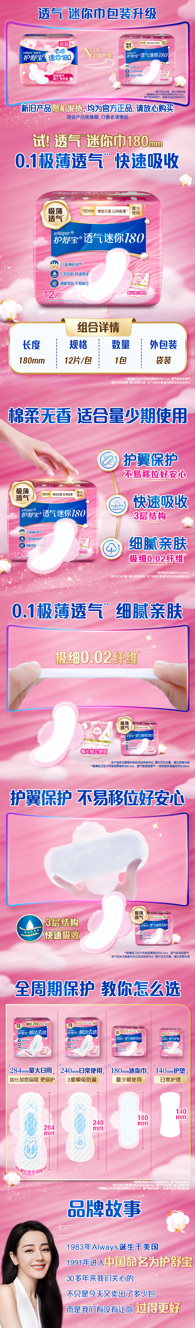 护舒宝(ALWAYS) 透气迷你 180MM 卫生巾12片装 粉色(单位:包)