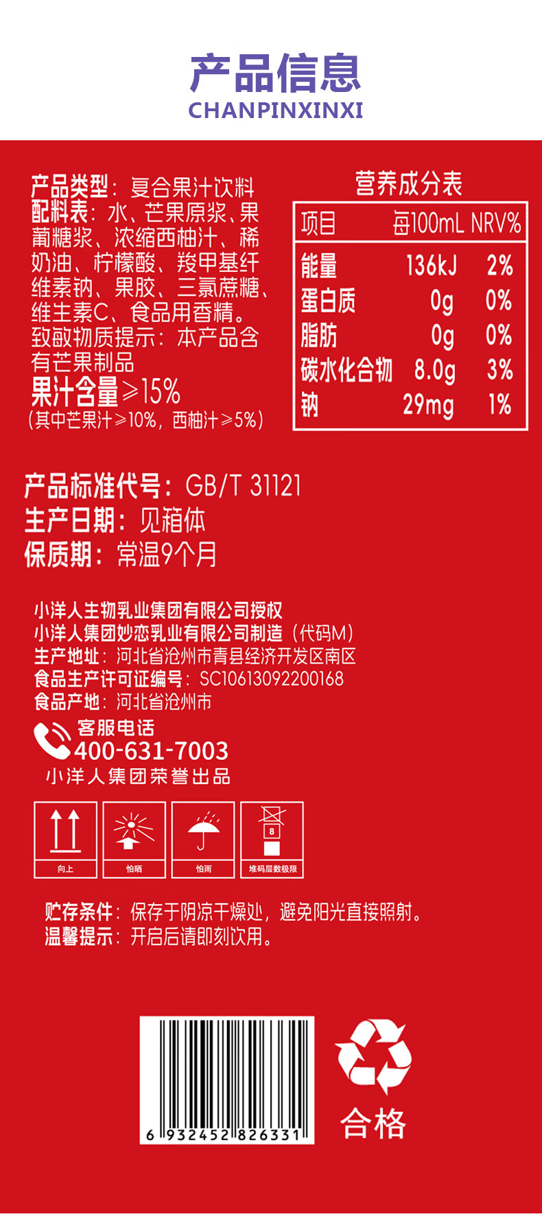 小洋人 杨枝甘露 复合果汁饮品 245ml*15瓶 红色(单位:提)