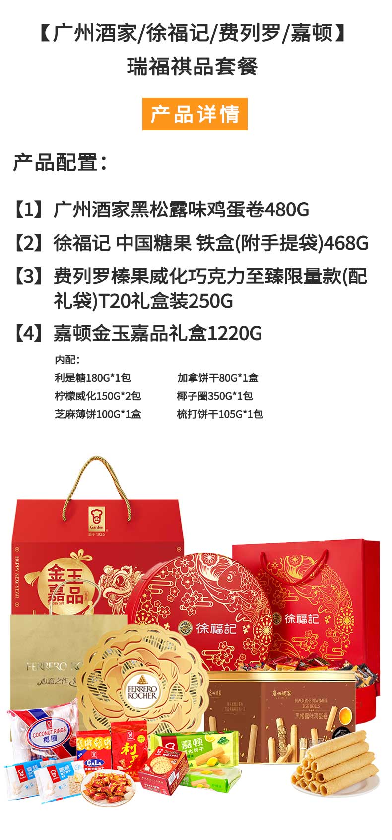 广州酒家 /徐福记/费列罗/嘉顿-蛋卷糖果巧克力饼干 瑞福祺品组合 2418g 红色(单位:套)