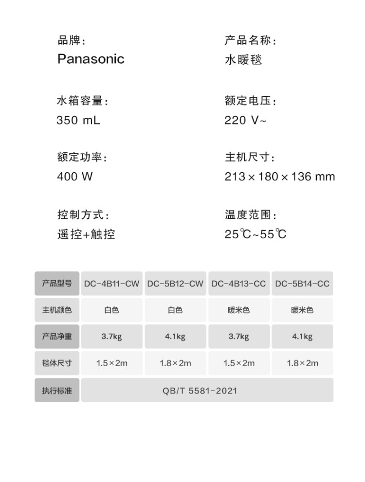 松下(Panasonic) 水暖毯 DC-5B12-CW 1.8*2m 白色(单位:台)