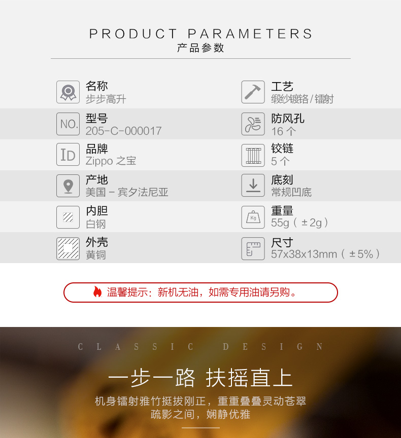Zippo 煤油打火机 205-C-000017 尺寸:57mm*38mm*13mm 锻纱镀铬-步步高升(单位:支)