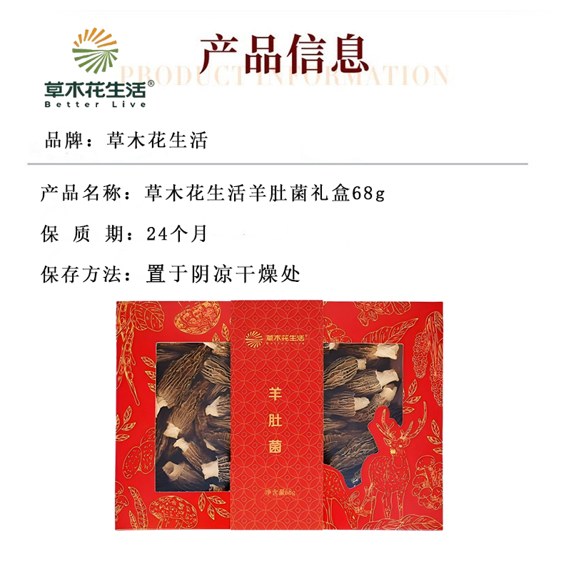 草木花生活 羊肚菌礼盒 天然农产品营养丰富 68g 红色(单位:盒)