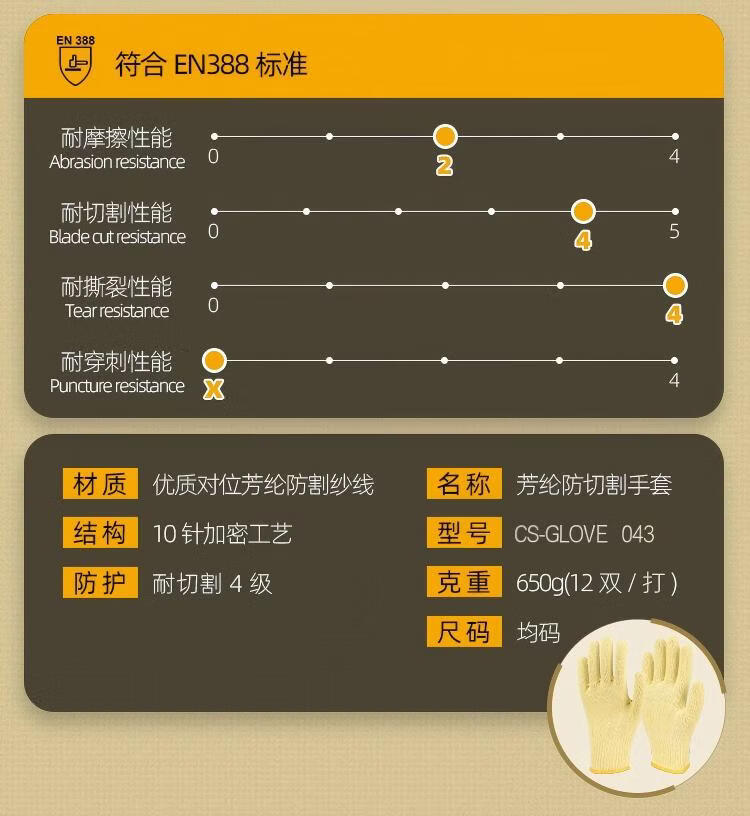驰色 10针芳纶钢丝混纺3级防割手套 CS-GLOVE 043 1双 无色(单位:双)