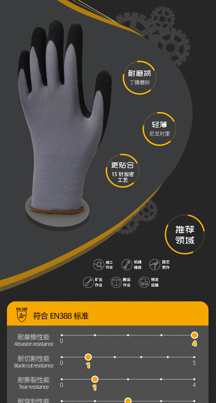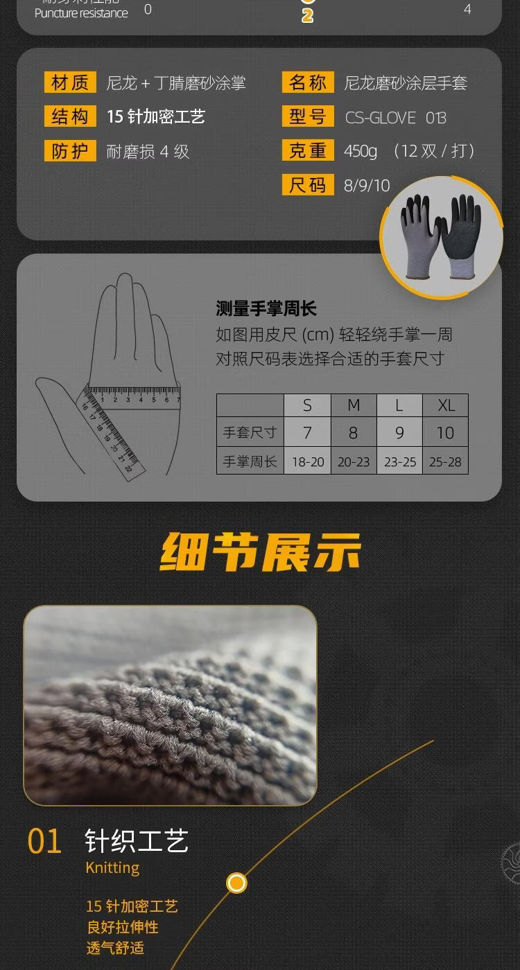 驰色 15针尼龙莱卡丁腈磨砂涂掌手套 CS-GLOVE 013 10双/打 无色(单位:打)