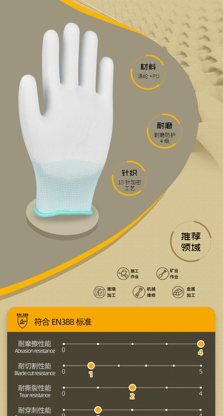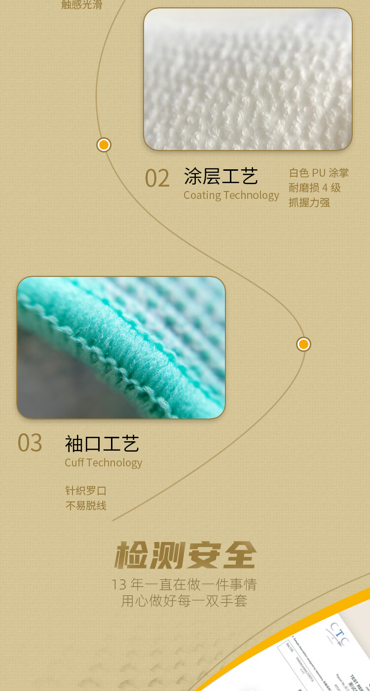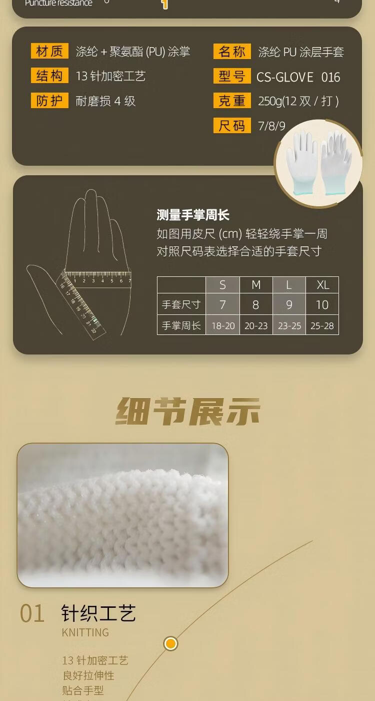 驰色 13针白涤纶白PU涂掌手套 CS-GLOVE 016 12双/打 白色(单位:打)