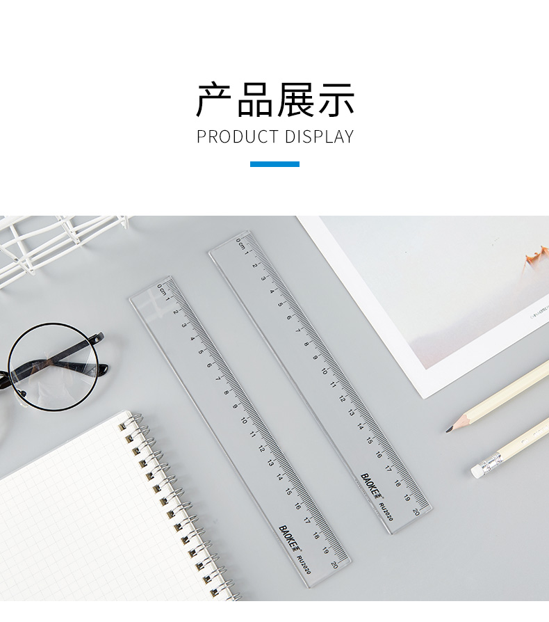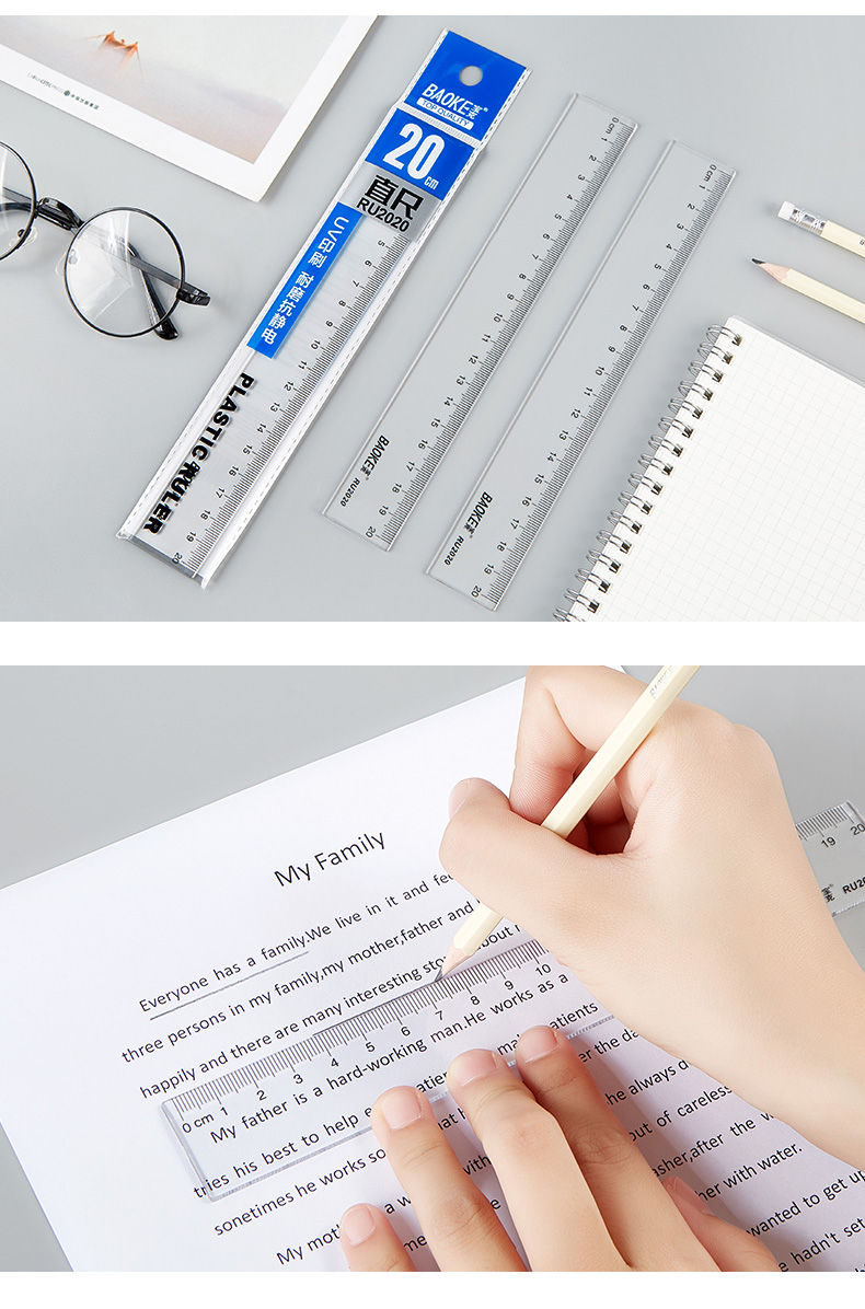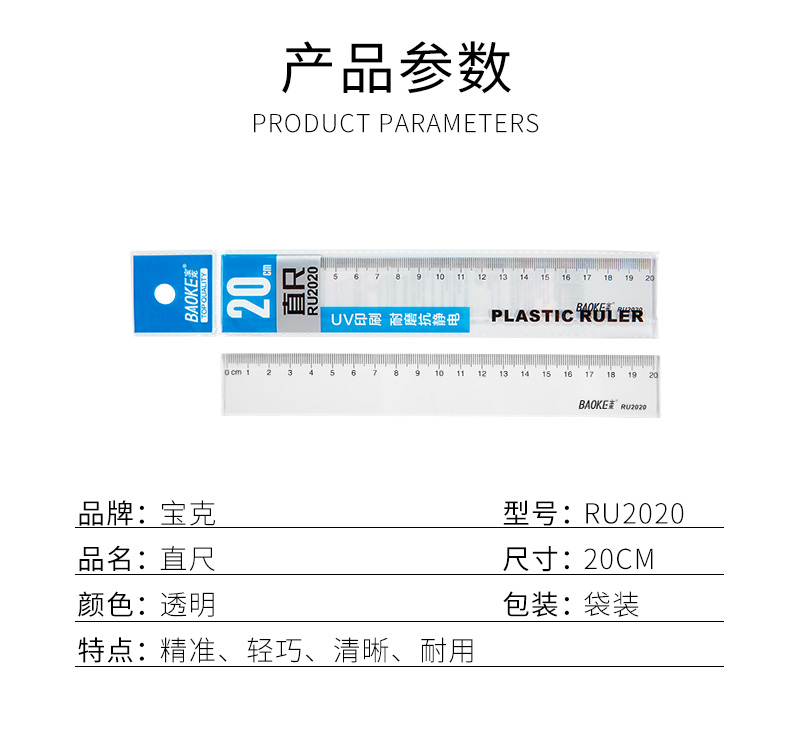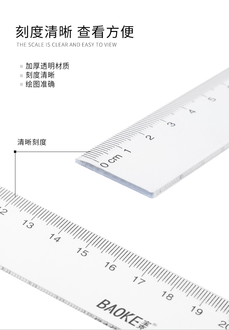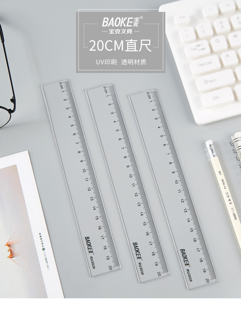 宝克(BAOKE)RU2020 20cm直尺 办公通用直尺透明尺子 10把/组 透明