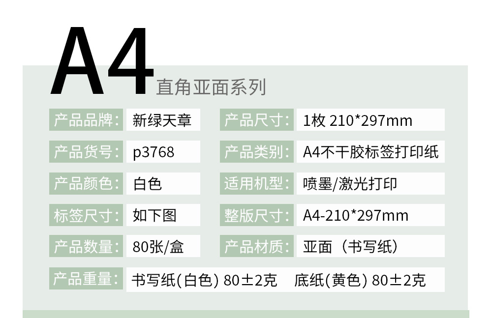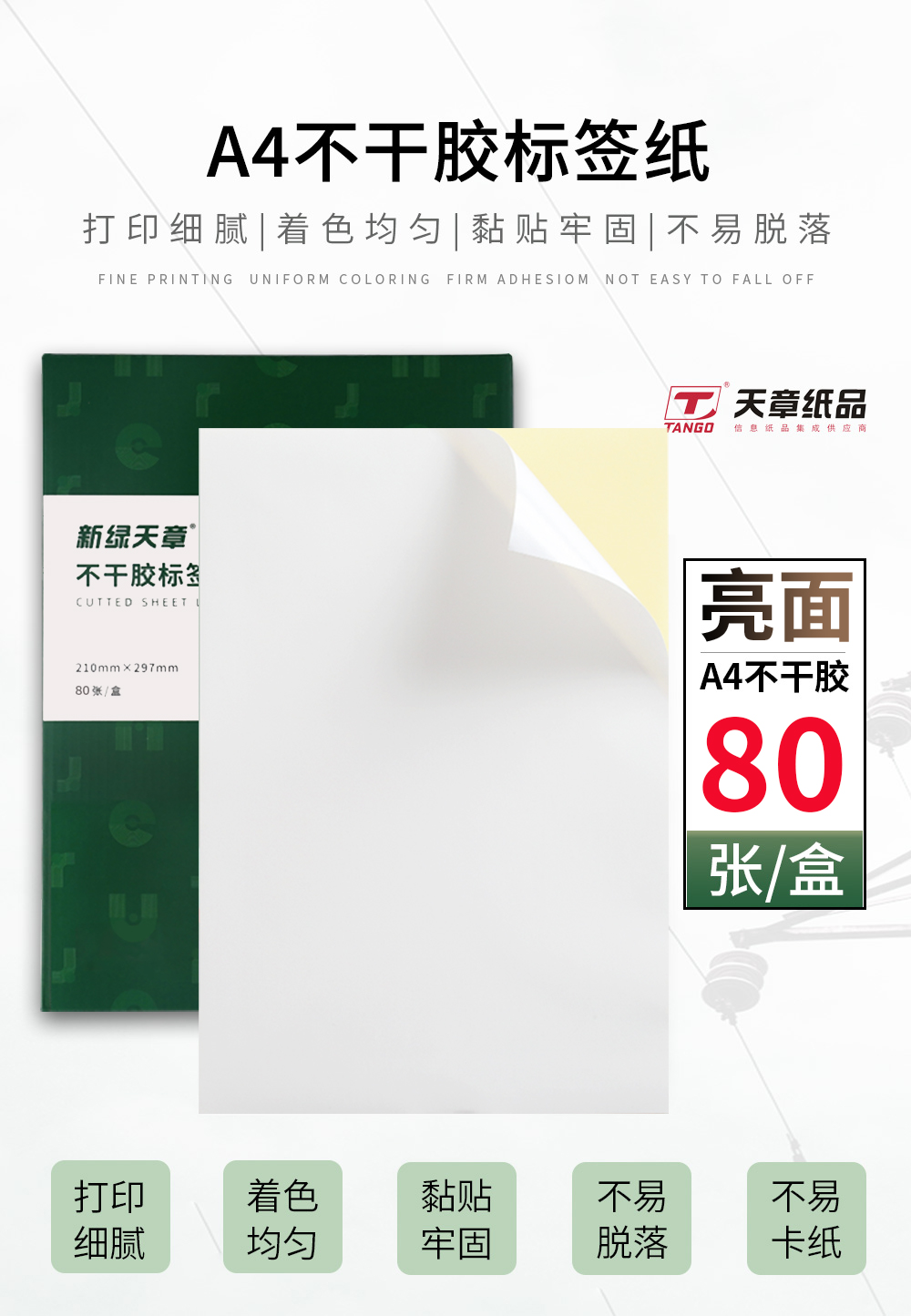 天章 (TANGO) P3766 A4亮面不干胶 80张/盒 不干胶标签打印贴纸 白色(单位:盒)