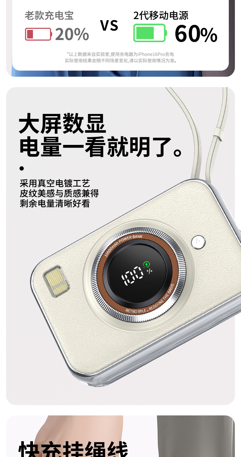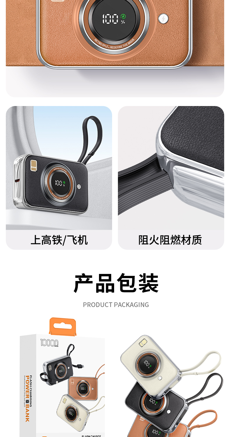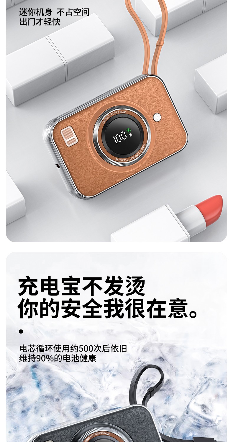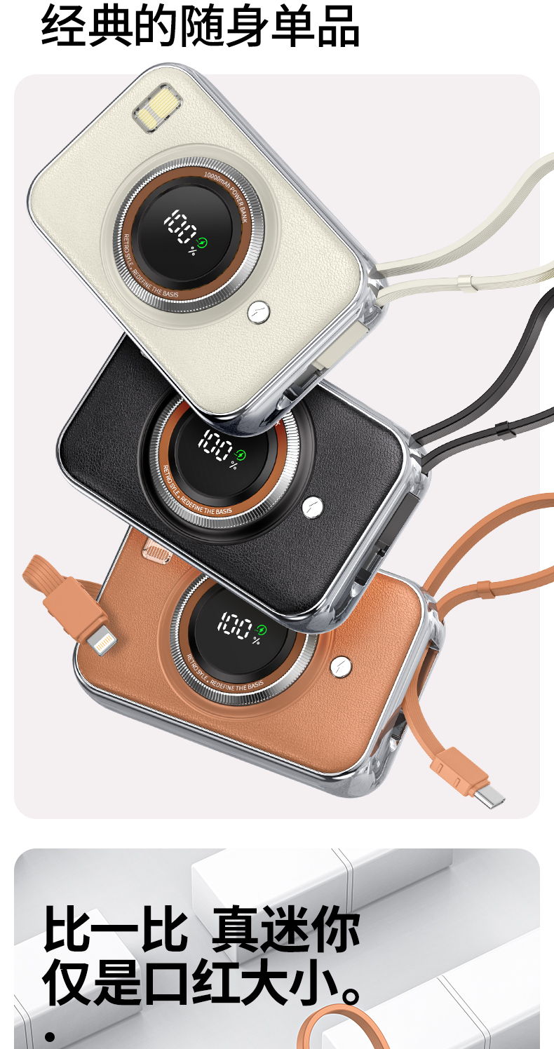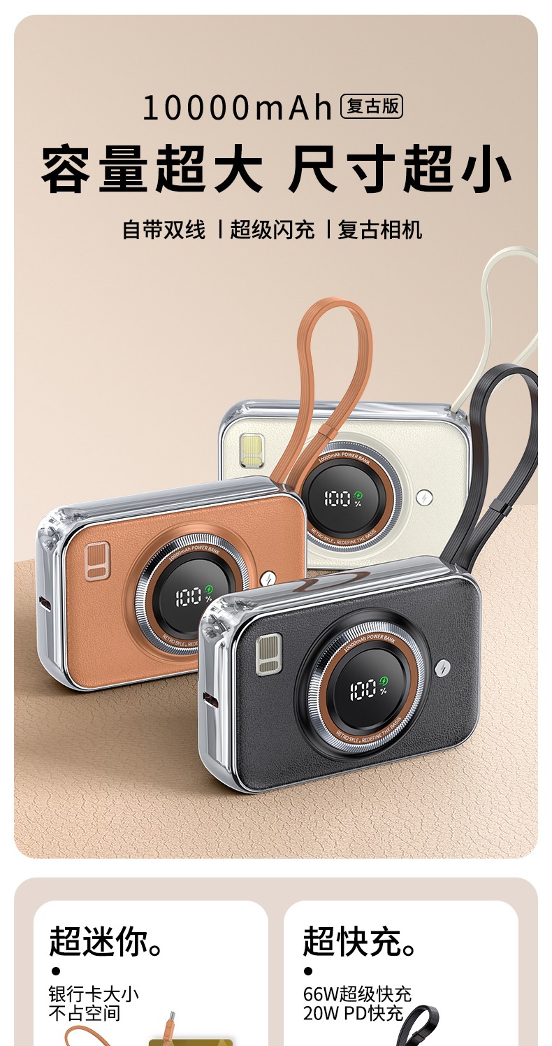 雷摄(LEISE) 相机形移动电源 LS-R69S 22.5W快充自带双线可上飞机便携小巧10000毫安 米白色(单位:件)