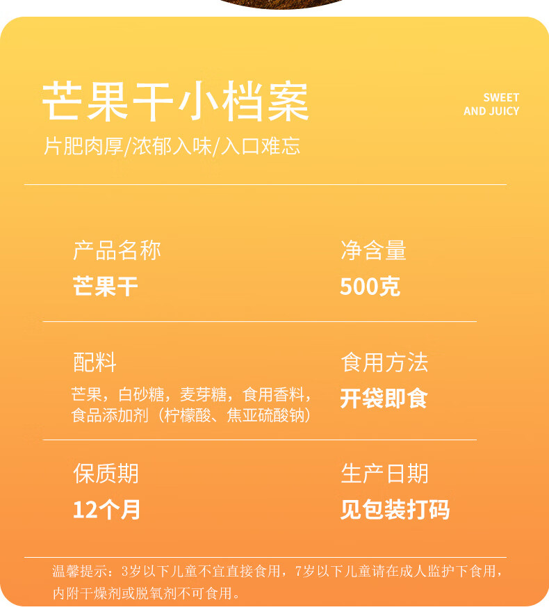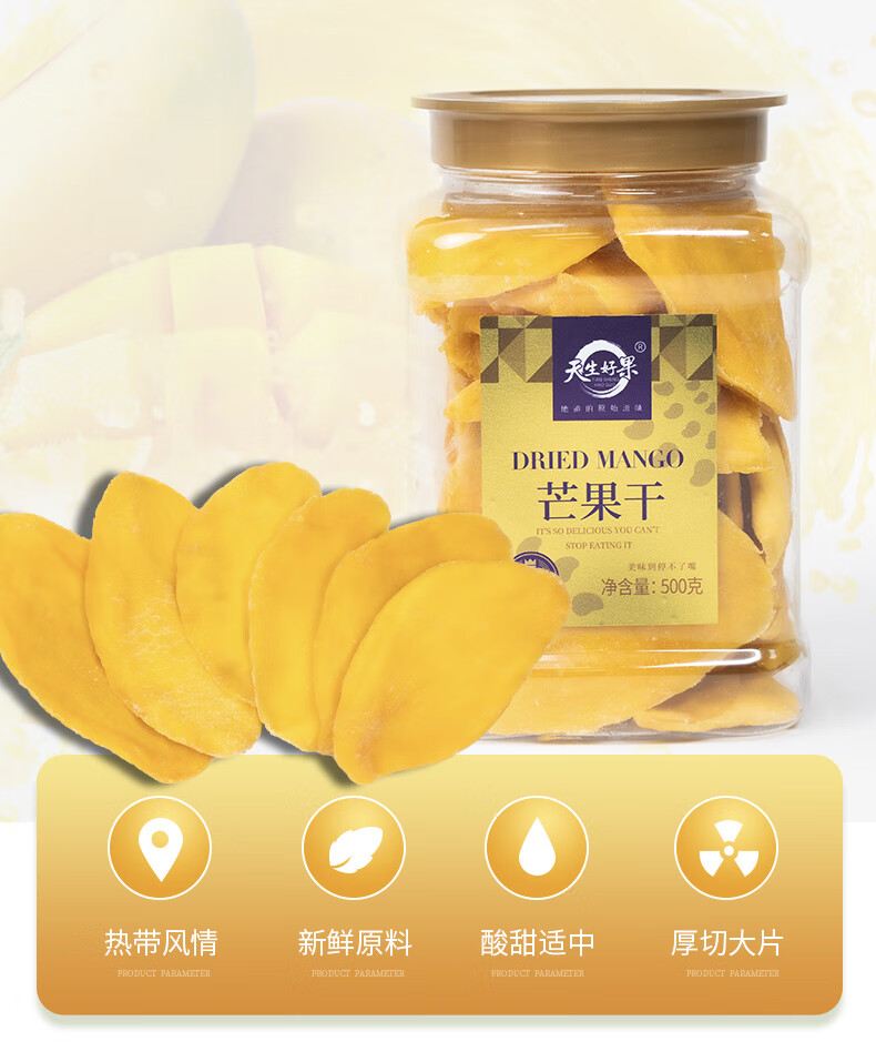 天生好果 芒果干 500g 休食水果干蜜饯果干 黄色(单位:罐)
