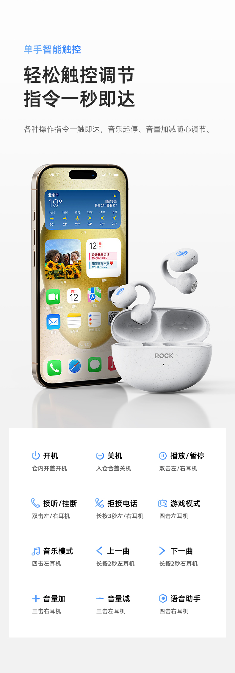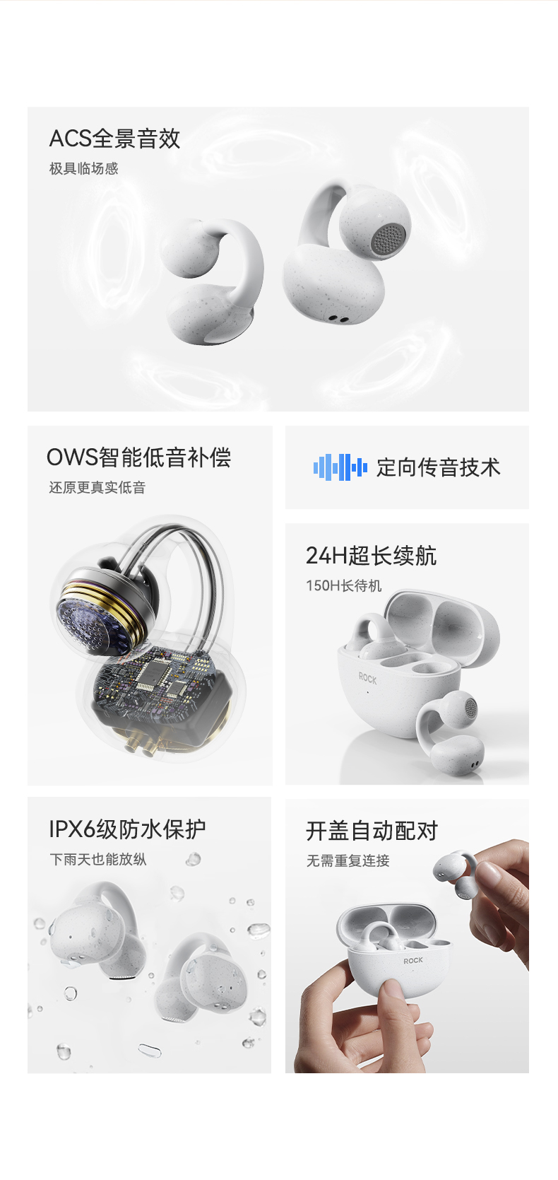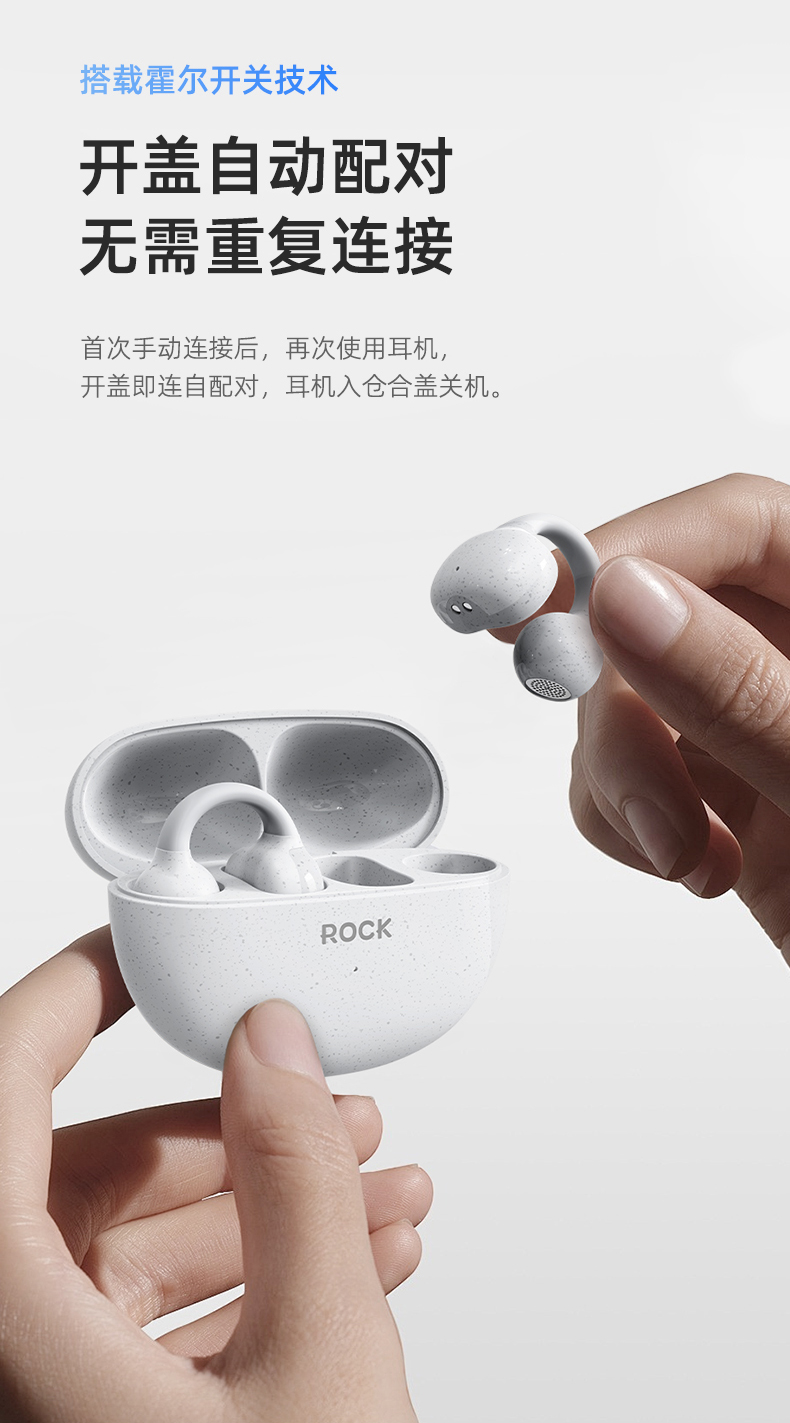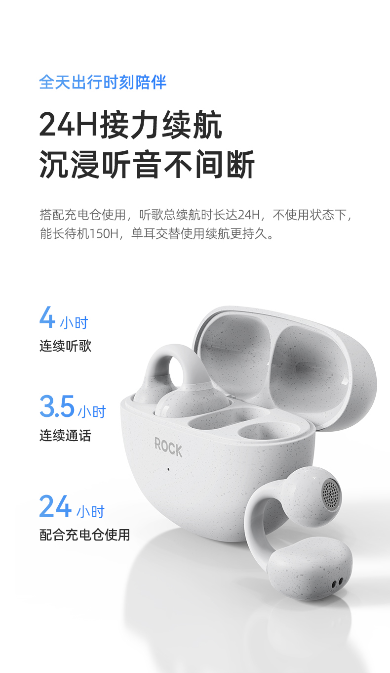 洛克(ROCK) 耳夹无线蓝牙耳机 RAU07590 电池容量:充电仓400mAh 皓月白(单位:副)