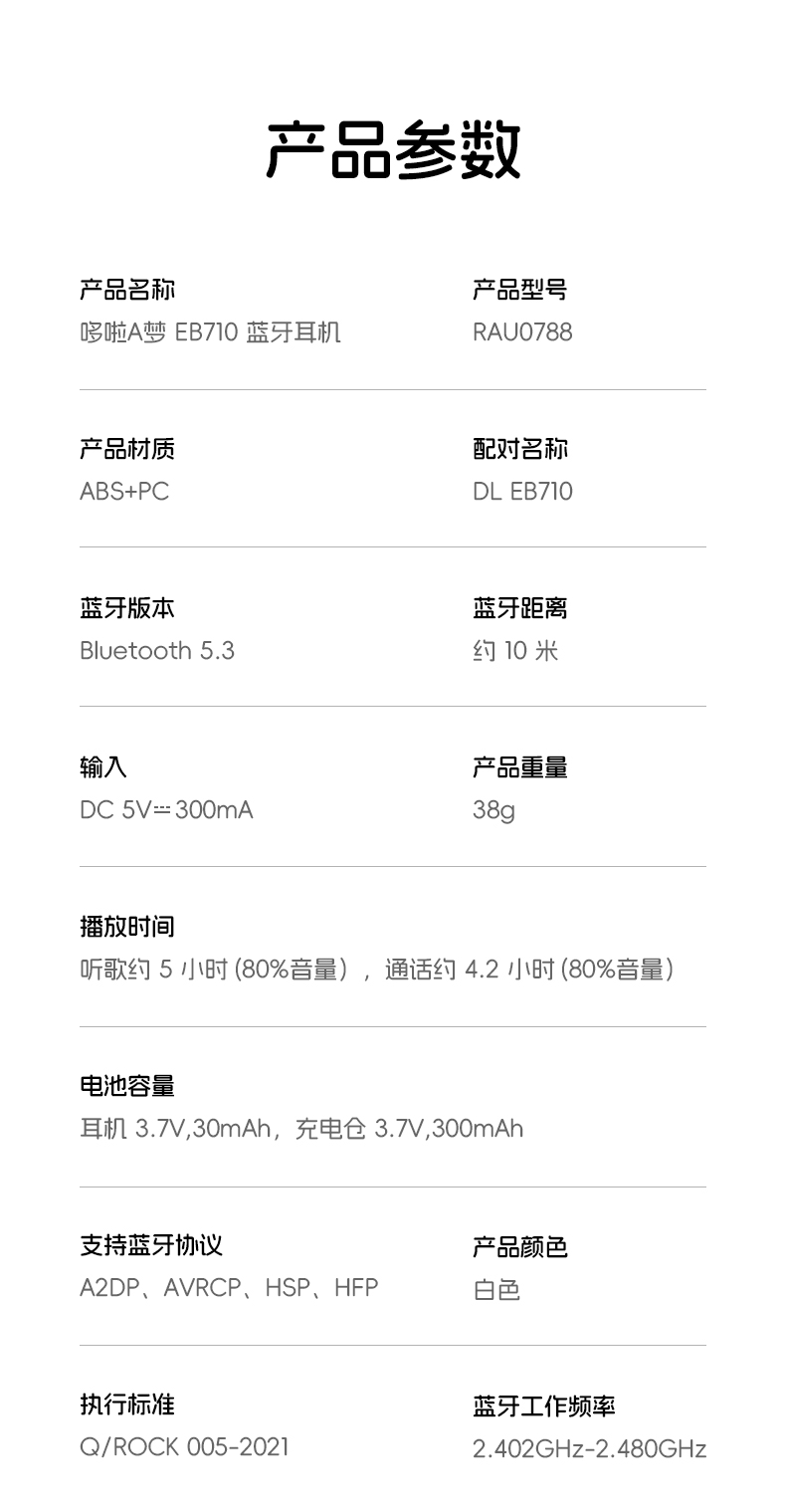 洛克(ROCK) TWS蓝牙耳机 RAU0788 产品重量:约38g 白色(单位:副)