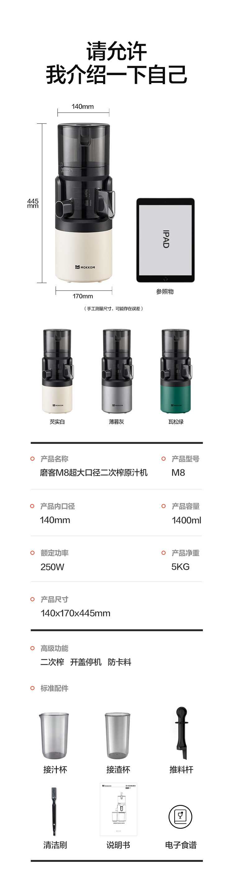 磨客(MOKKOM) 大口径14CM榨汁机 M8-W 1400ML 芡实白(单位:台)