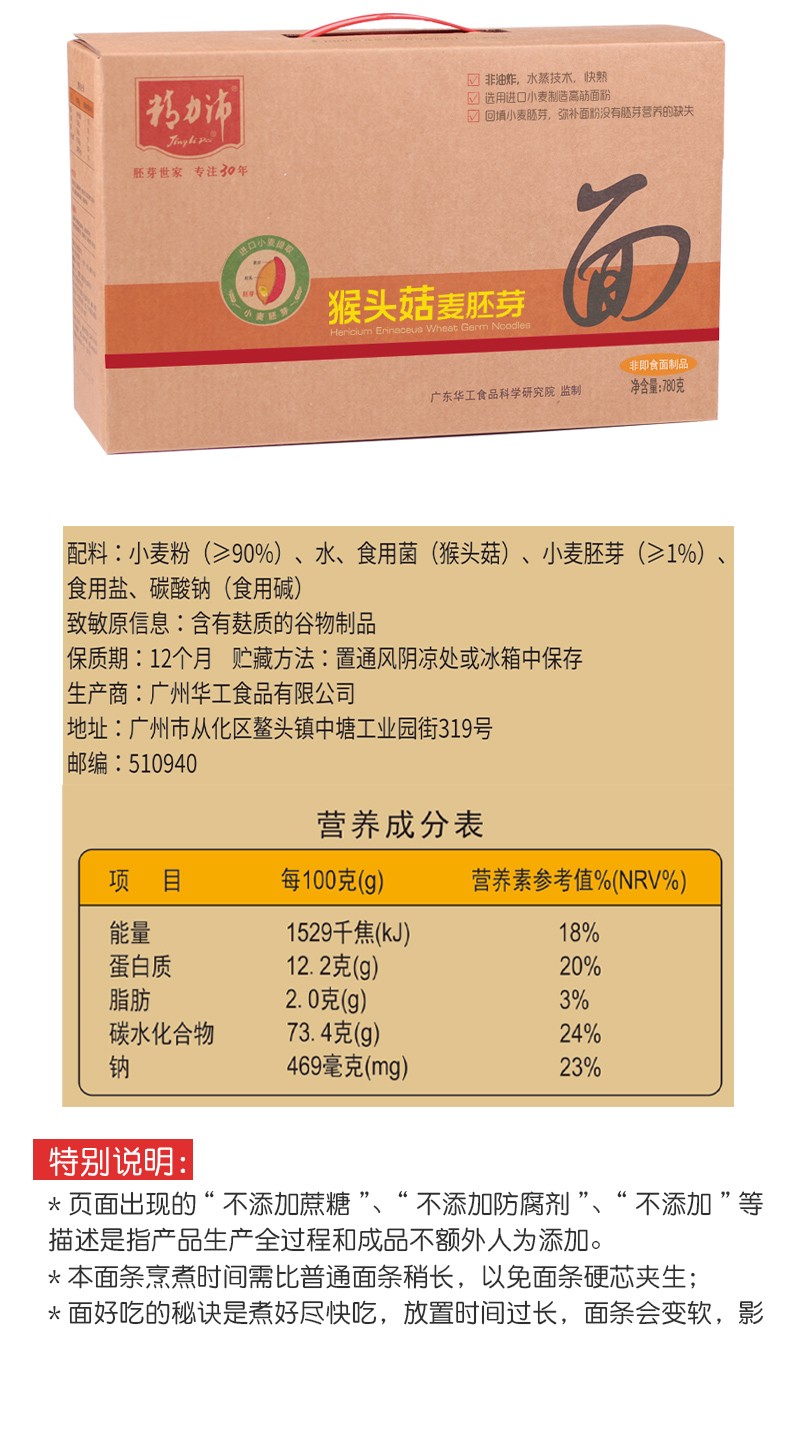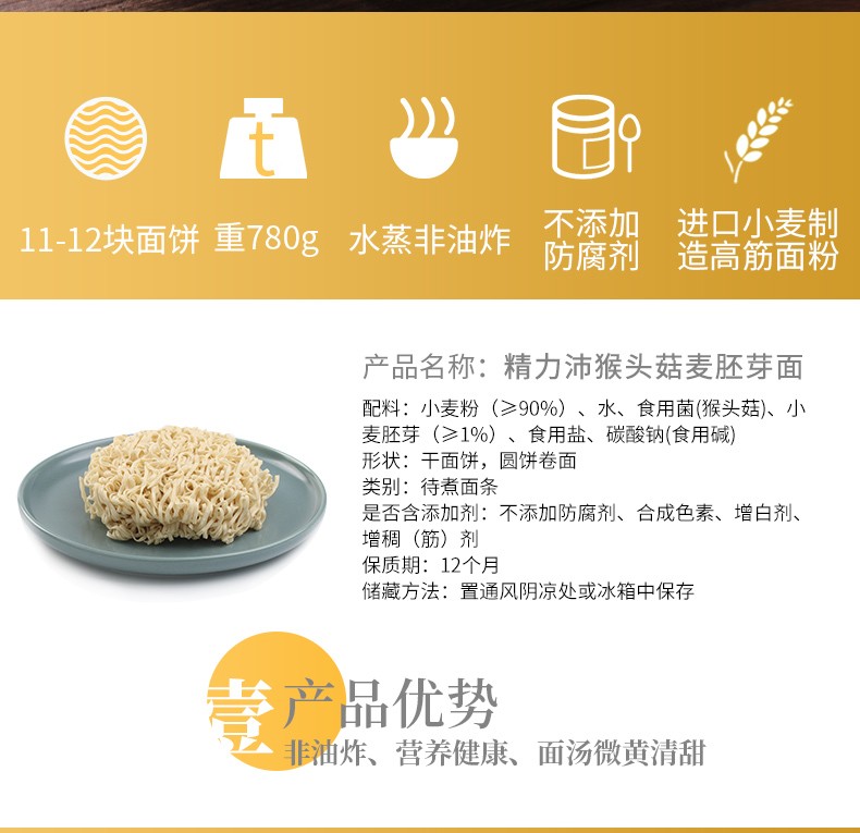 精力沛非油炸方便速食猴头菇麦胚芽面780g 箱 黄色