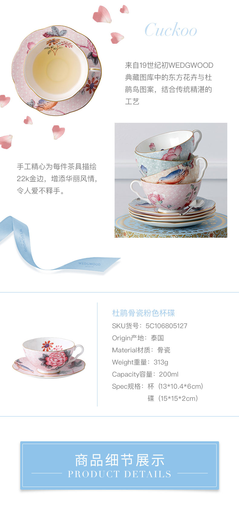 WEDGWOOD 威基伍德杜鹃杯碟组 5C106805127 200ML*1 粉色(单位:套)
