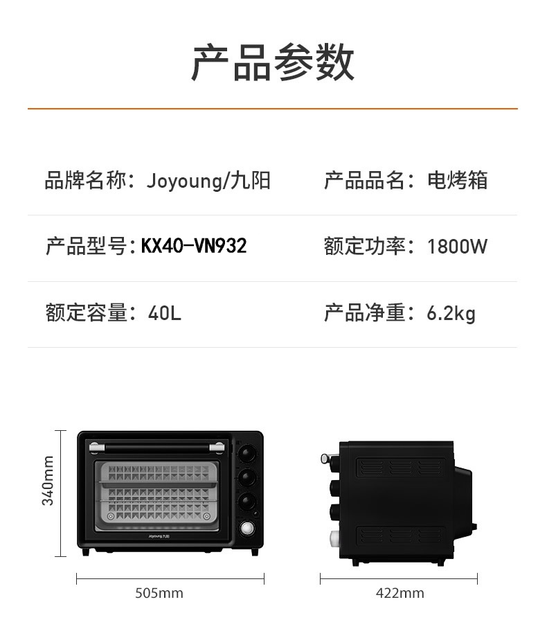 九阳(Joyoung) 电烤箱 KX40-VN932 40L 黑色(单位:台)