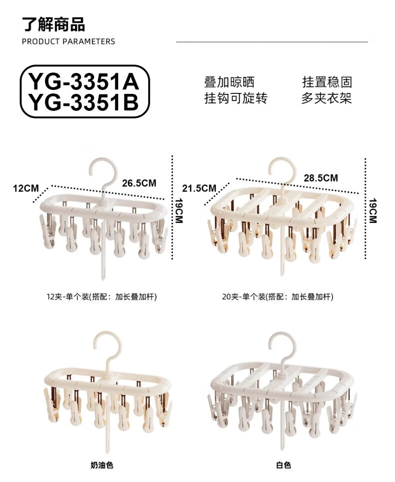 优勤(YOUQIN) 阳光晾晒架12夹 JR-YG-3351AYGLSJ12J-BS-975Y 26.5*12*15cm 白色(单位:个)