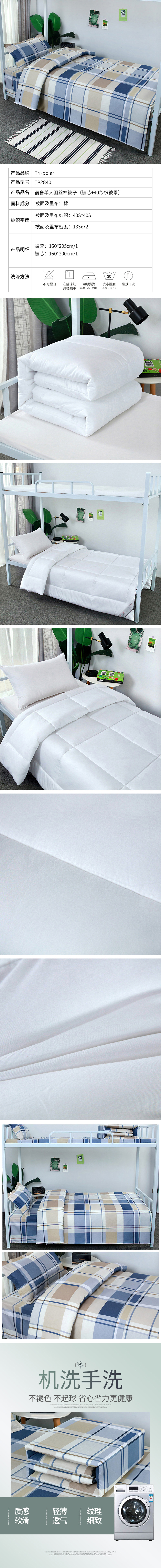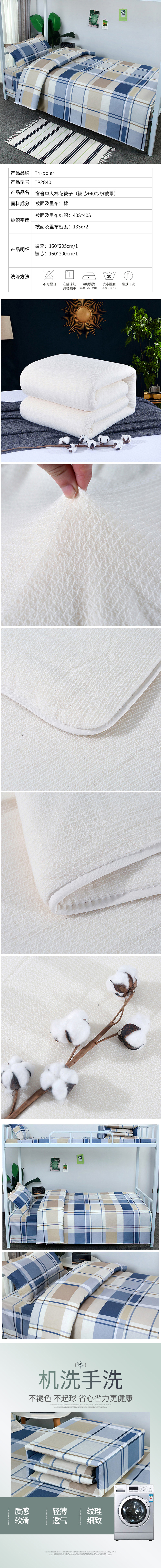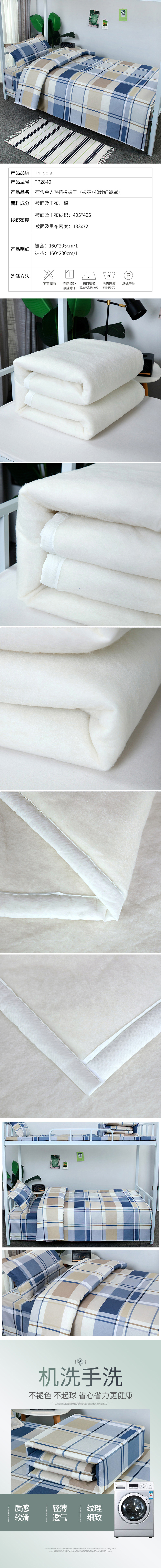 三极 TP2840 棉被芯+40纱支被罩 蓝色格子 160*205cm 热熔棉被芯