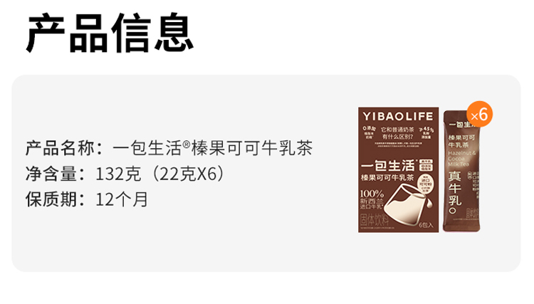 一包生活 冲泡奶茶热饮0添加植脂末 榛果可可牛乳茶 132g(22g*6条/盒) 混色(单位:盒)