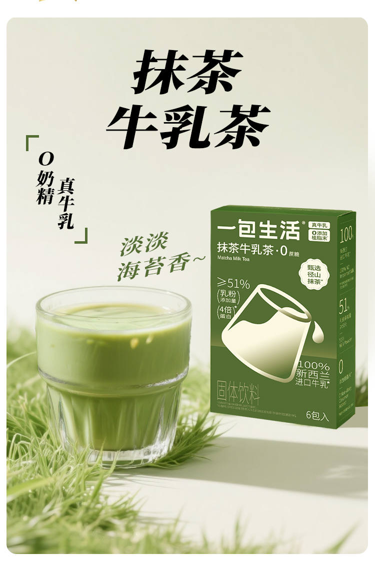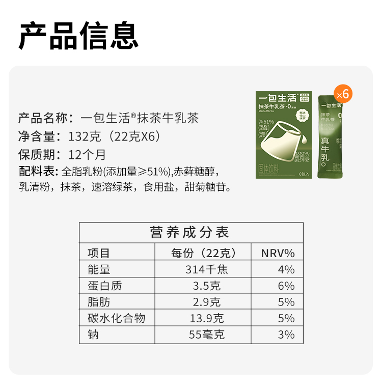 一包生活 冲泡奶茶热饮0添加植脂末 抹茶牛乳茶 132g(22g*6条) 混色(单位:盒)