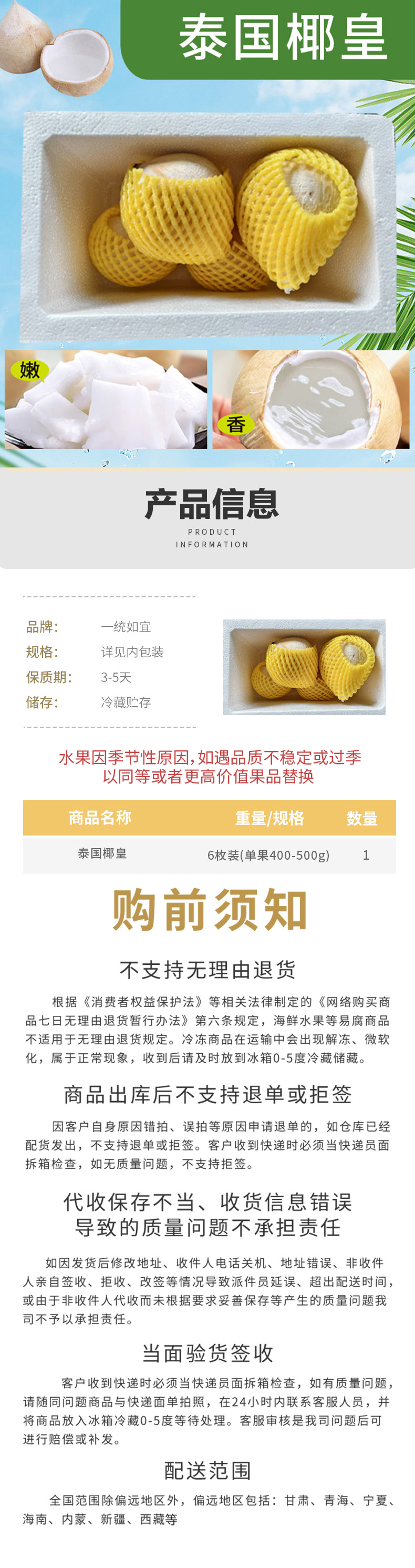 一统如宜 泰国椰子 单果400-500g 6枚装 白色(单位:盒)