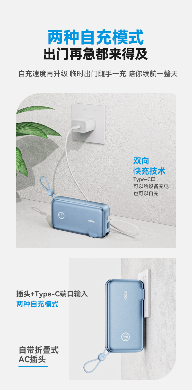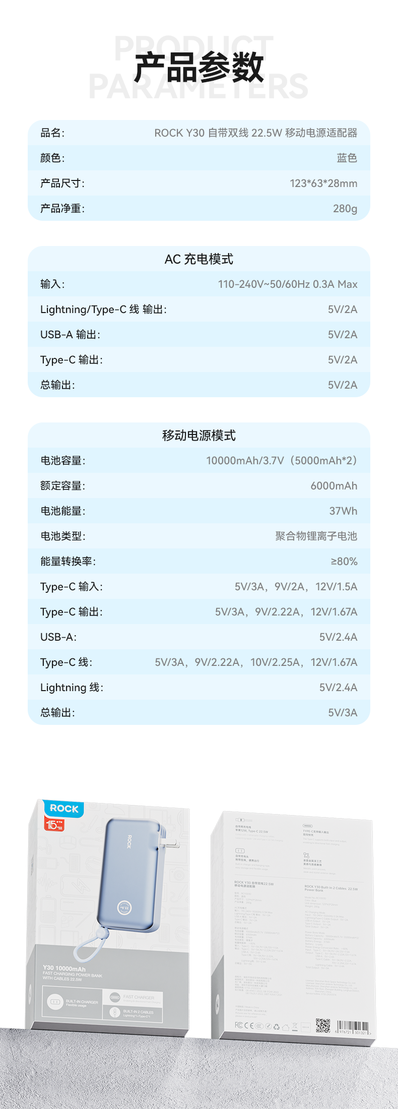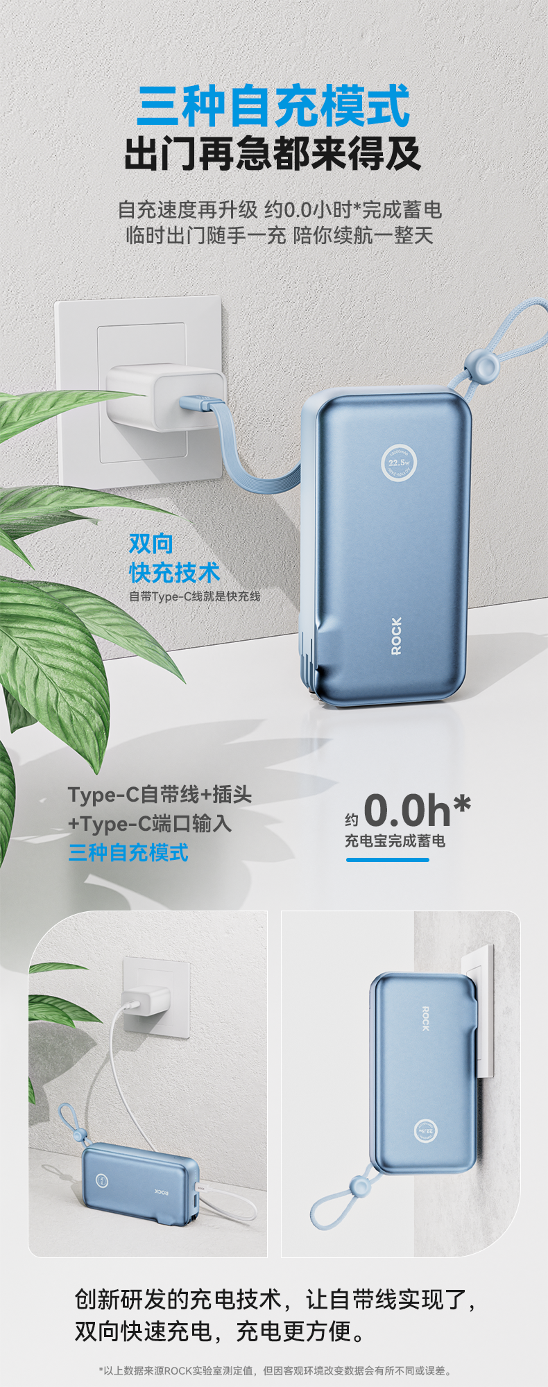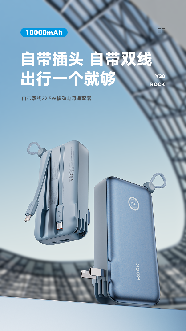 洛克(ROCK) 自带插头 双线22.5W 移动电源适配器 RCY0030 10000mAh 蓝色(单位:个)