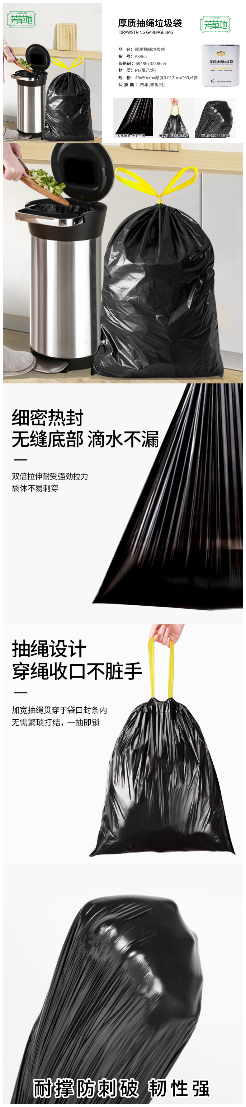 芳草地 抽绳垃圾袋 A38655FCD 45*50cm*60只/包*2 曜石黑(单位:组)