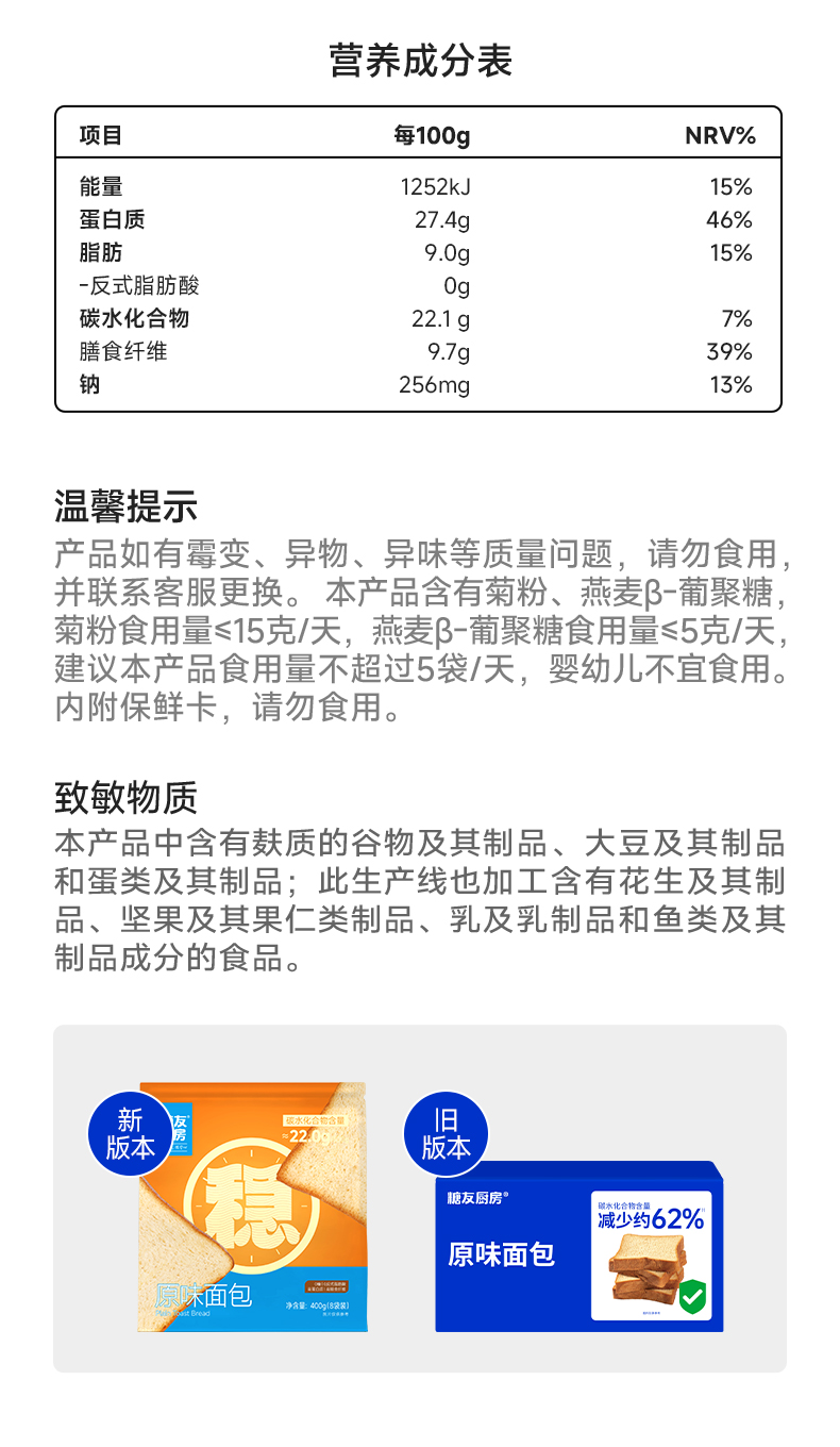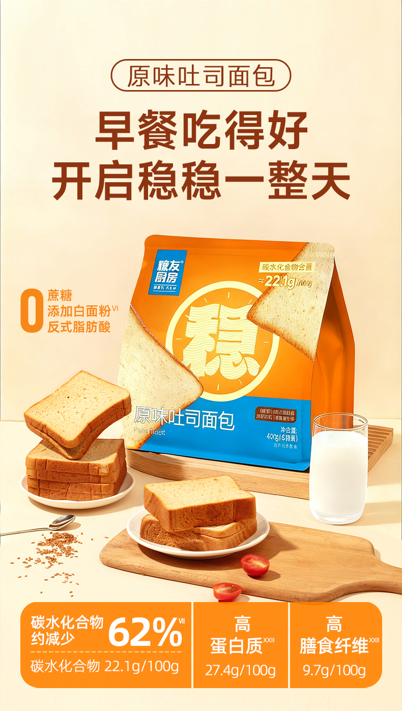 糖友厨房 原味面包 0蔗糖0白面粉 400g 橙色(单位:袋)