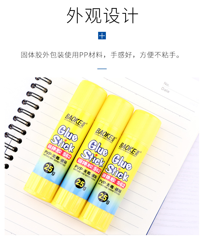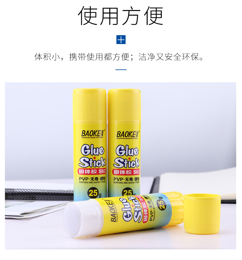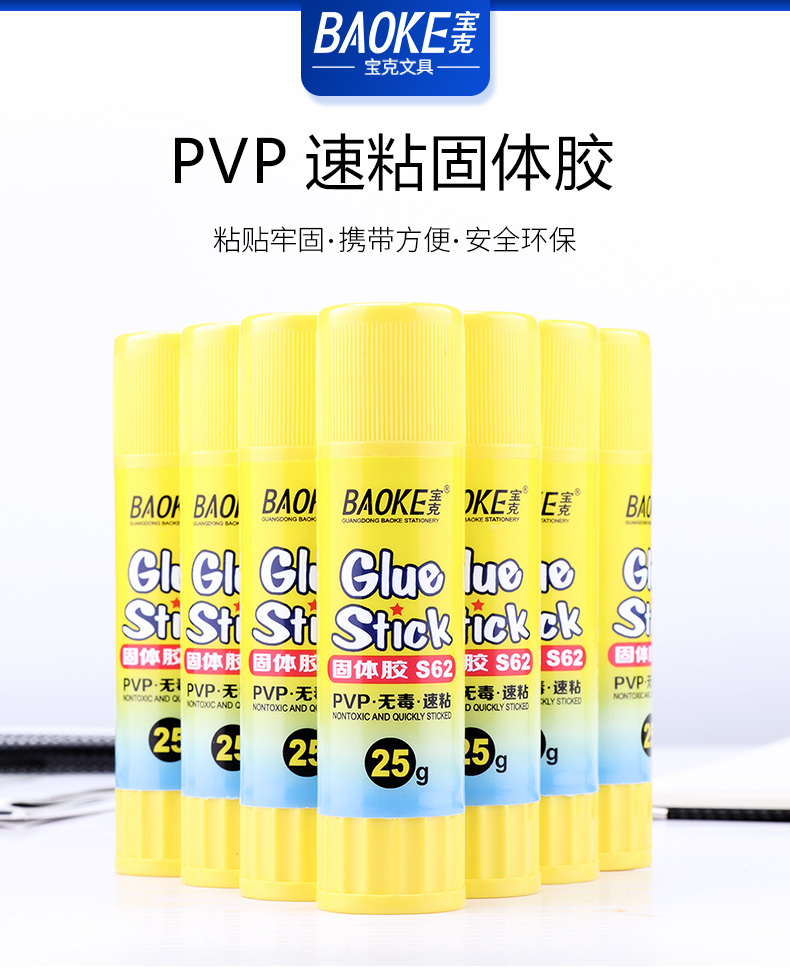宝克(BAOKE)S62 25g固体胶 高粘度PVP固体胶水 无甲醛快干耐用胶 12瓶/盒 黄色
