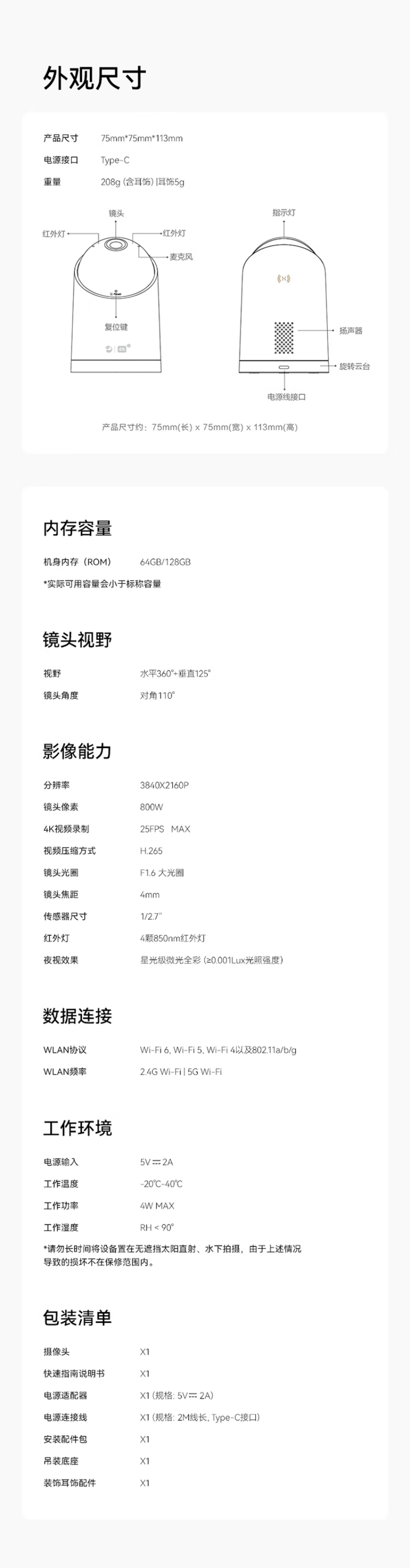 华为智选 海雀智能摄像头3 4K双频版 64GB(单位:个) 白色