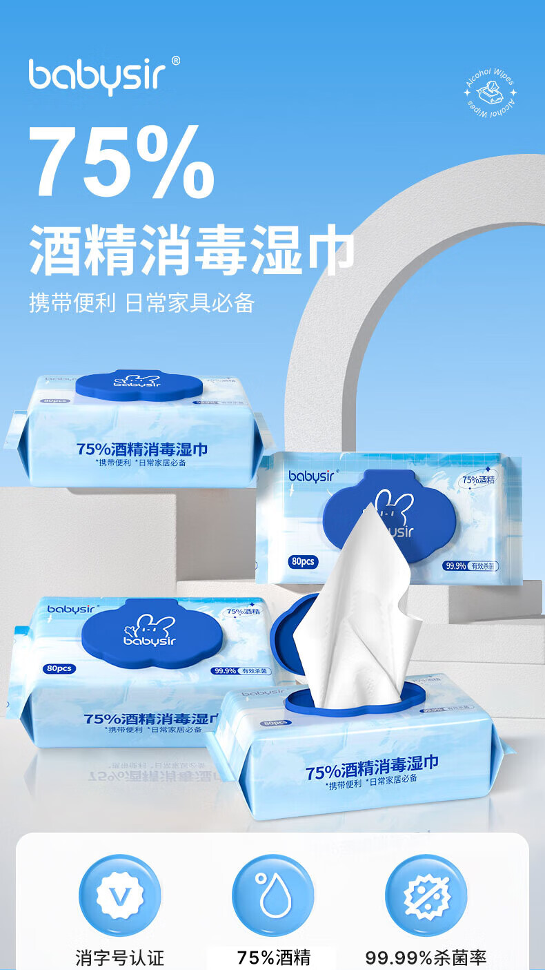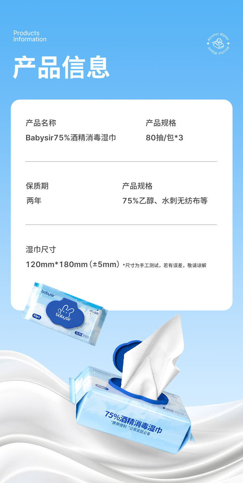 Babysir 酒精湿巾 80抽/包*3包 卫生湿纸巾 蓝色(单位:包)