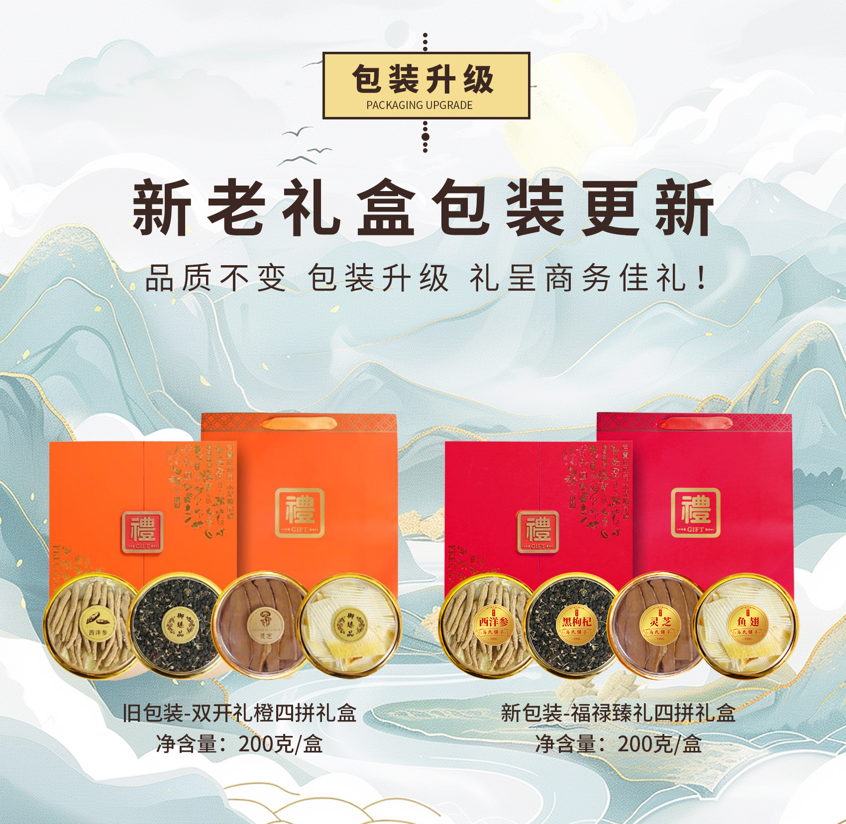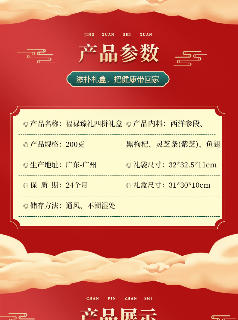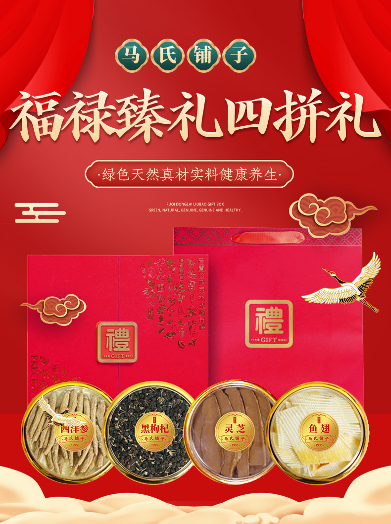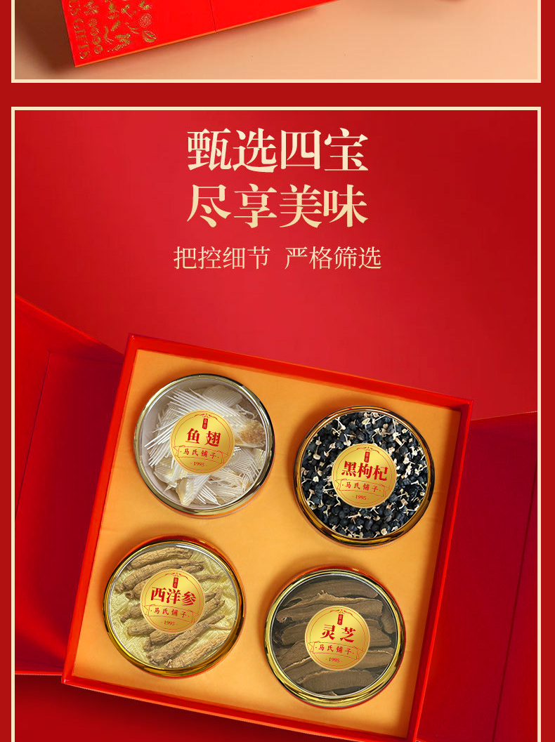 宝堂马氏铺子 福禄臻礼四拼礼盒 西洋参根/黑枸杞/灵芝/鱼翅 200克/盒 红色(单位:盒)