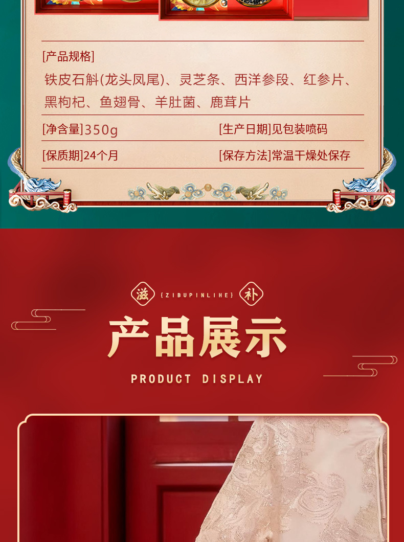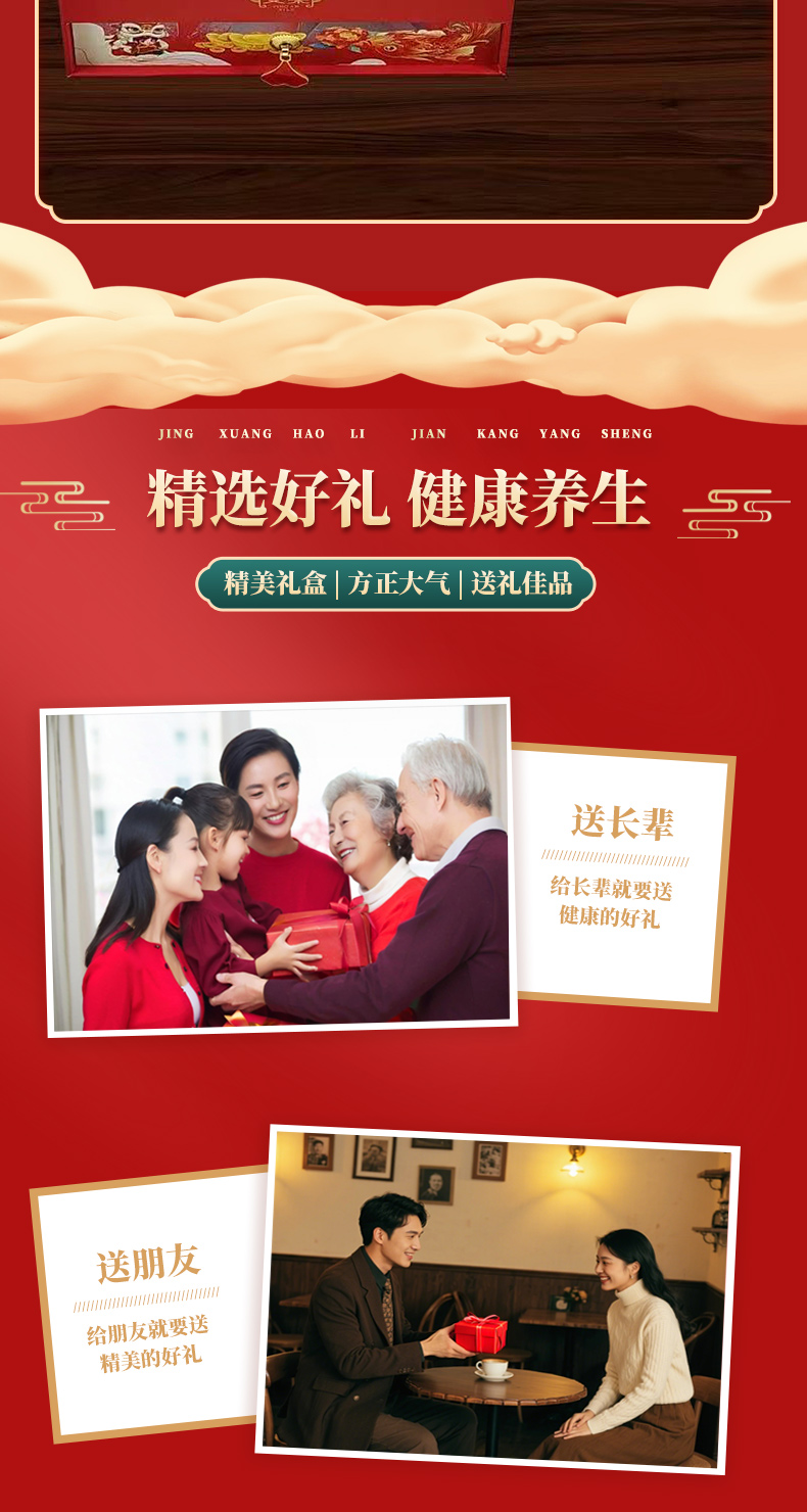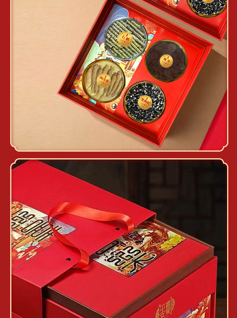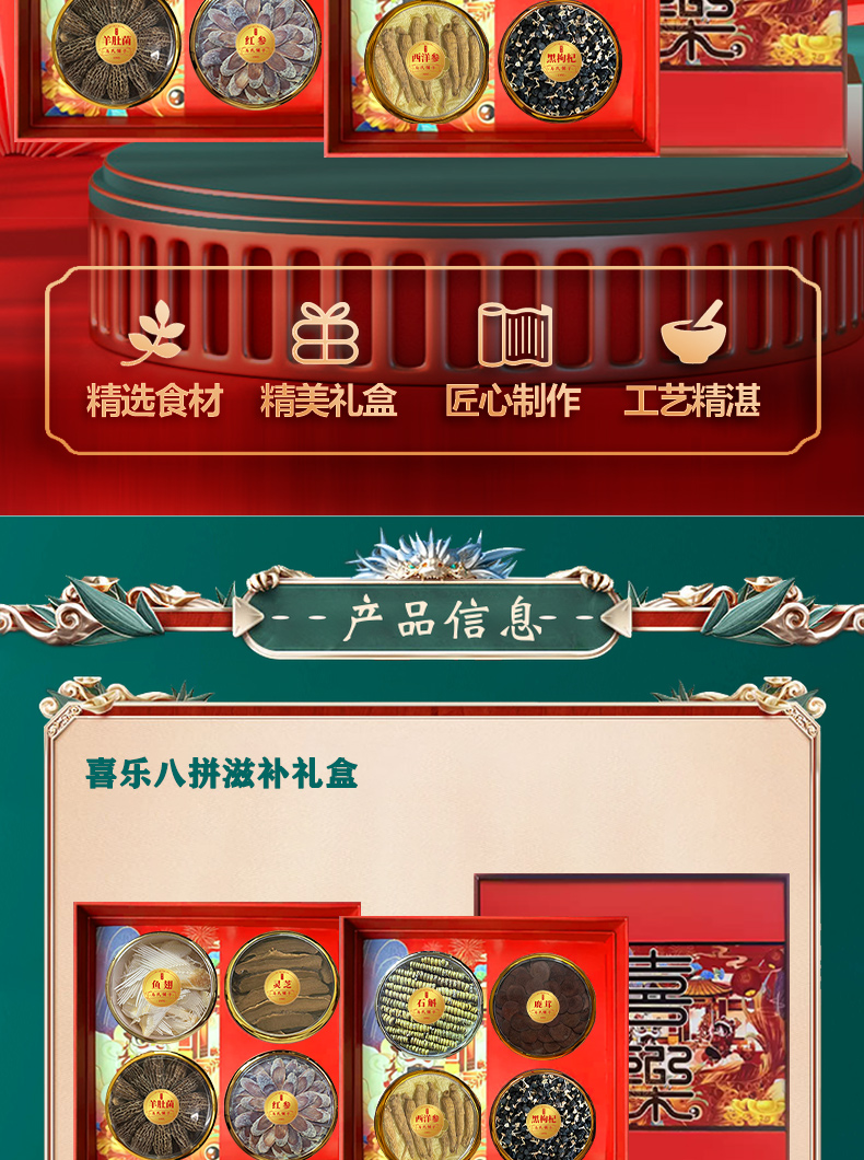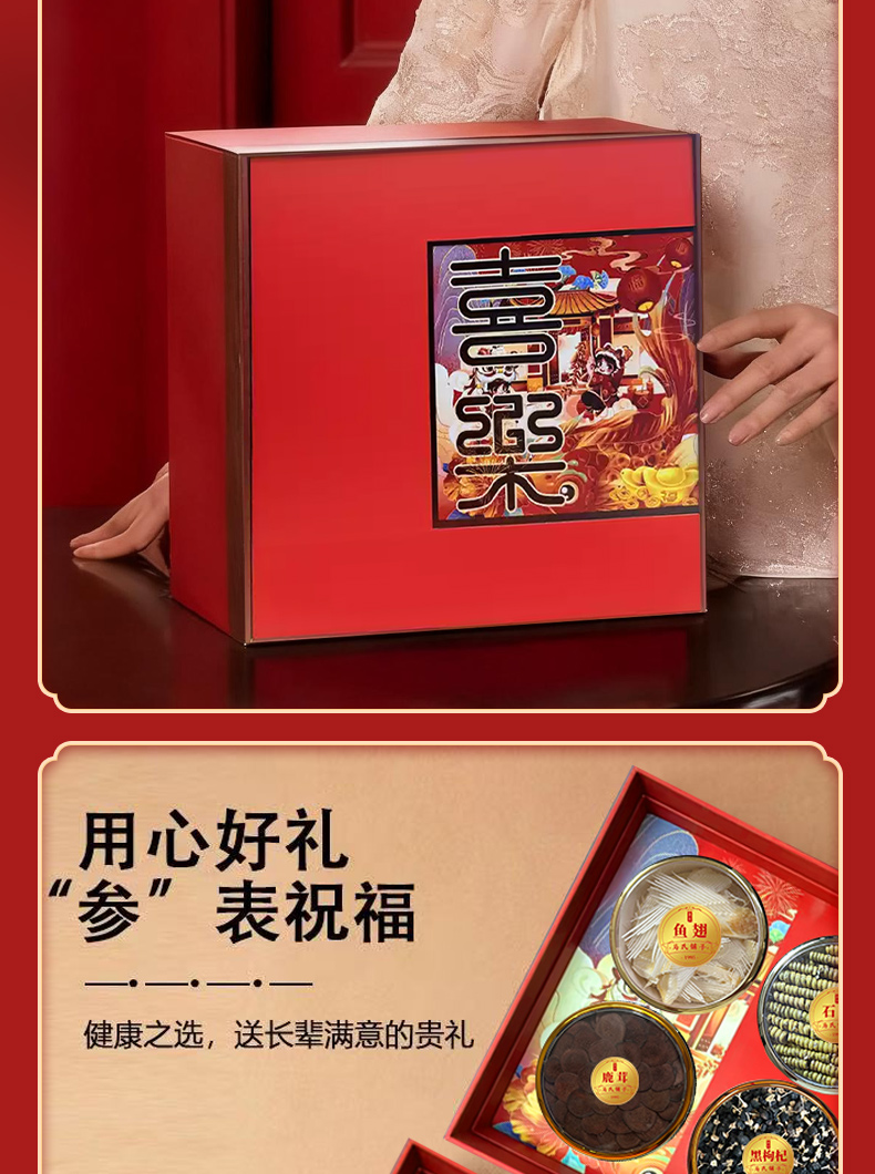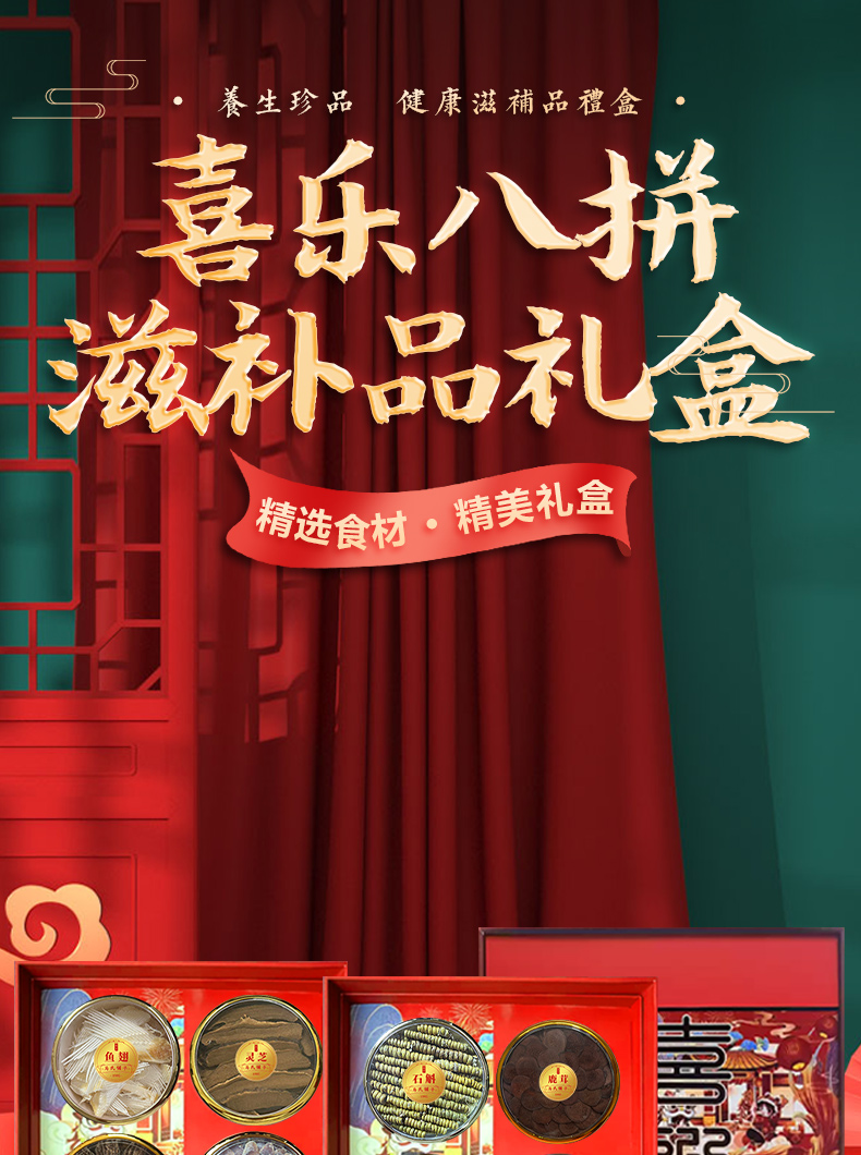 宝堂马氏铺子 喜乐八拼礼盒 (铁皮石斛龙头凤尾/陈皮/鳕鱼胶/西洋参片/灵芝条/黑枸杞/红参片/羊肚菌) 360克/盒 红色(单位:盒)