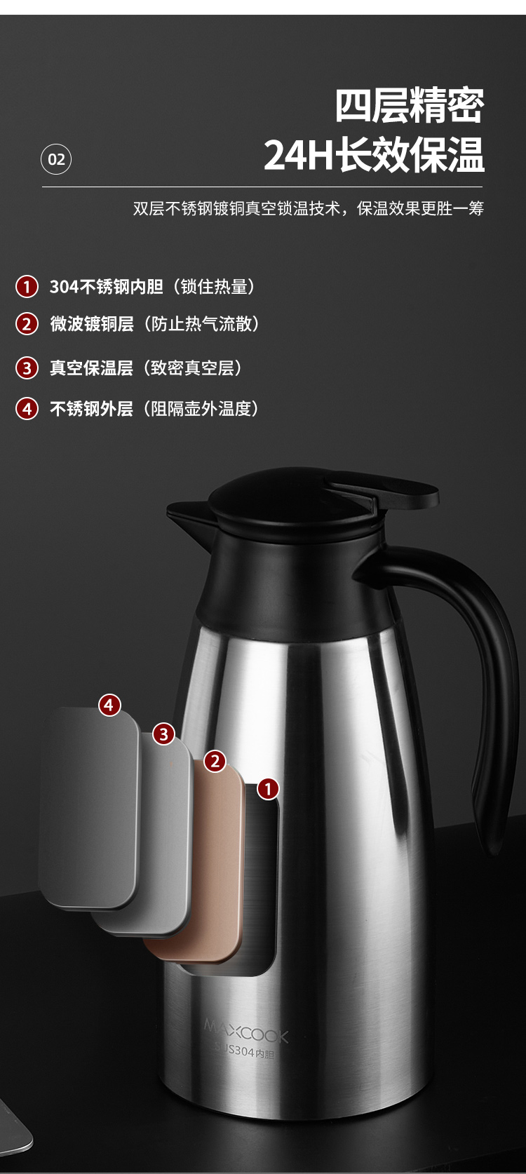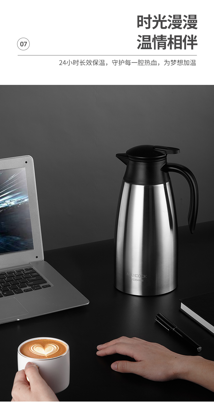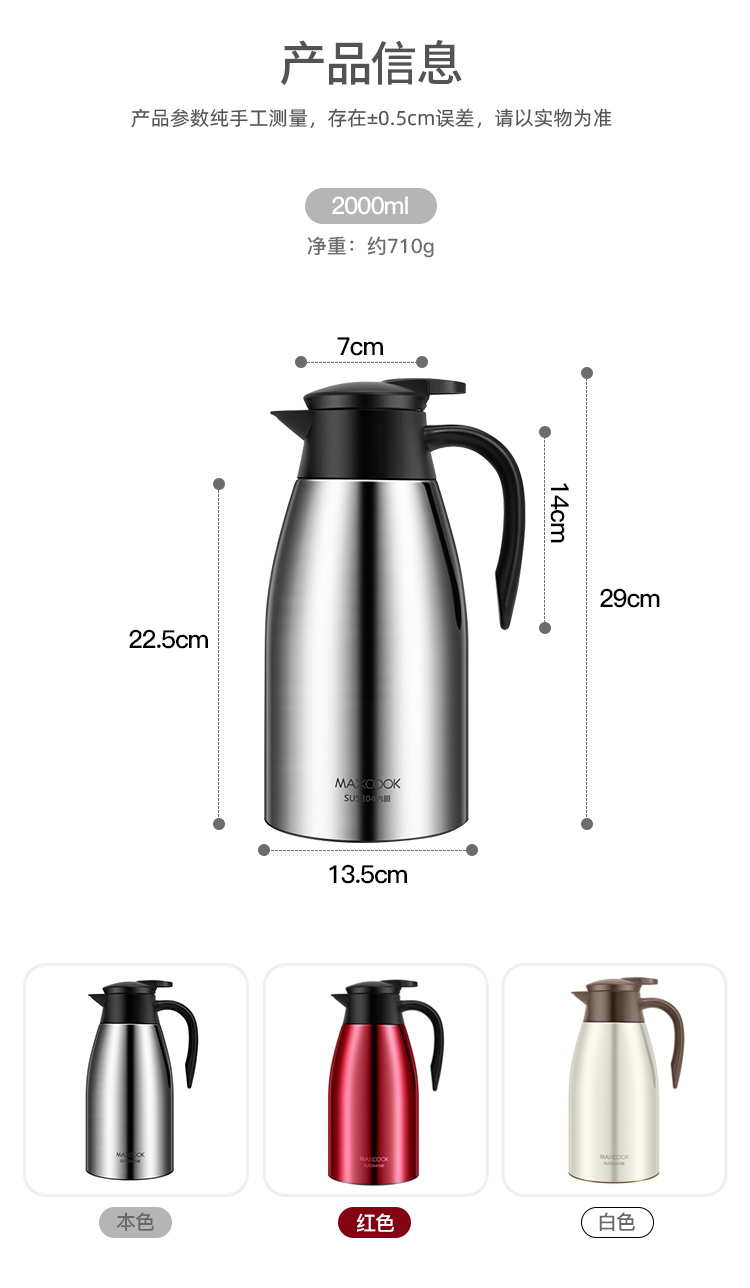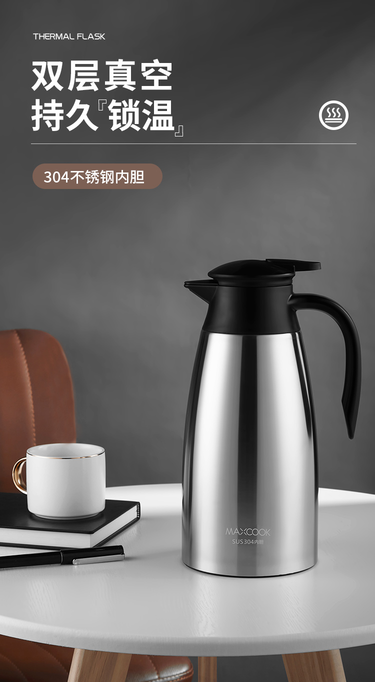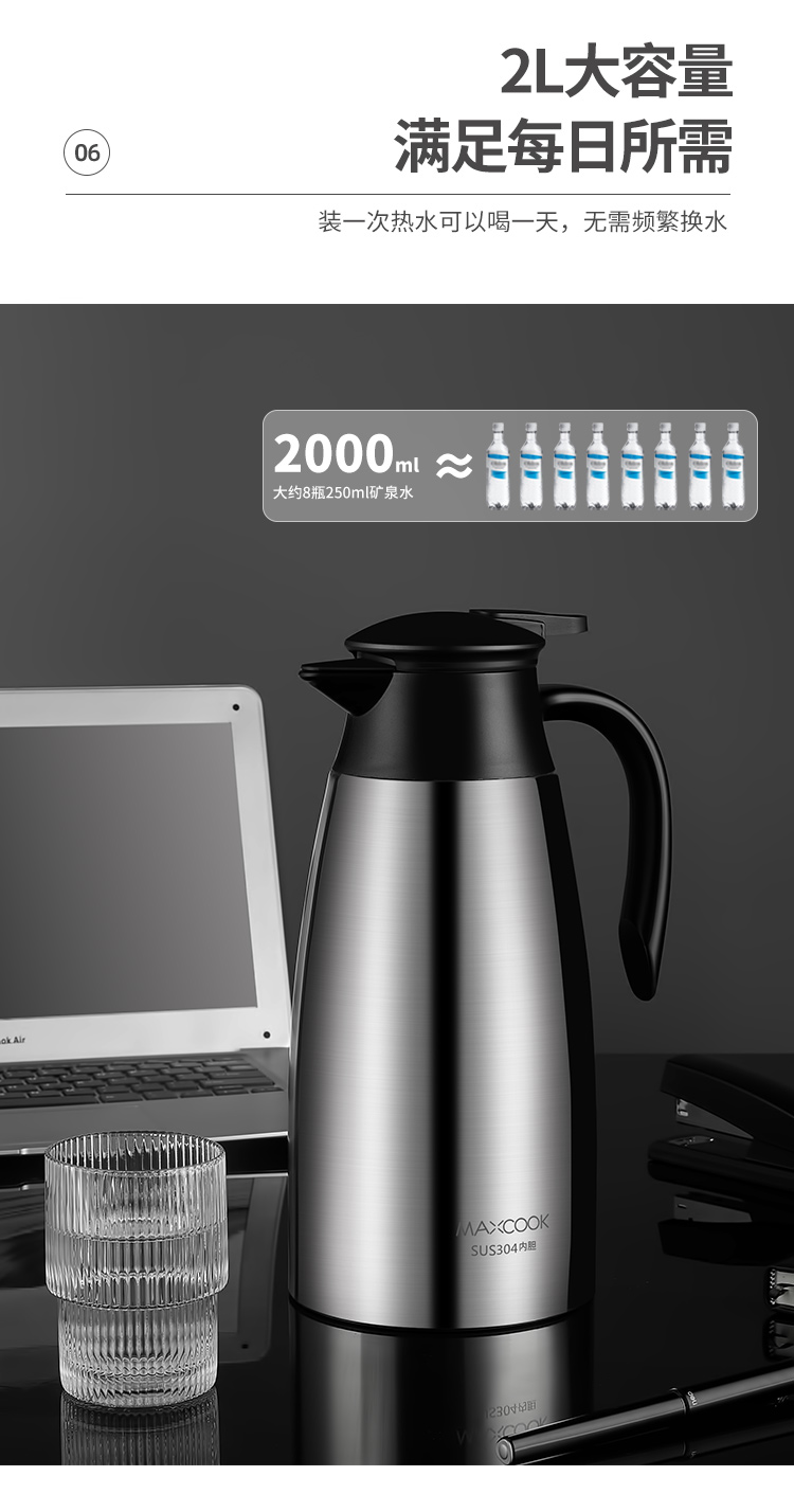 美厨304不锈钢真空保温壶水壶2L MCB390 不锈钢色