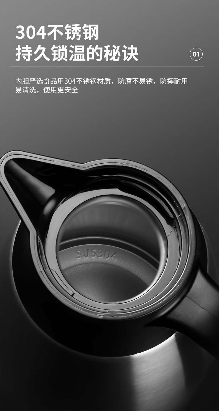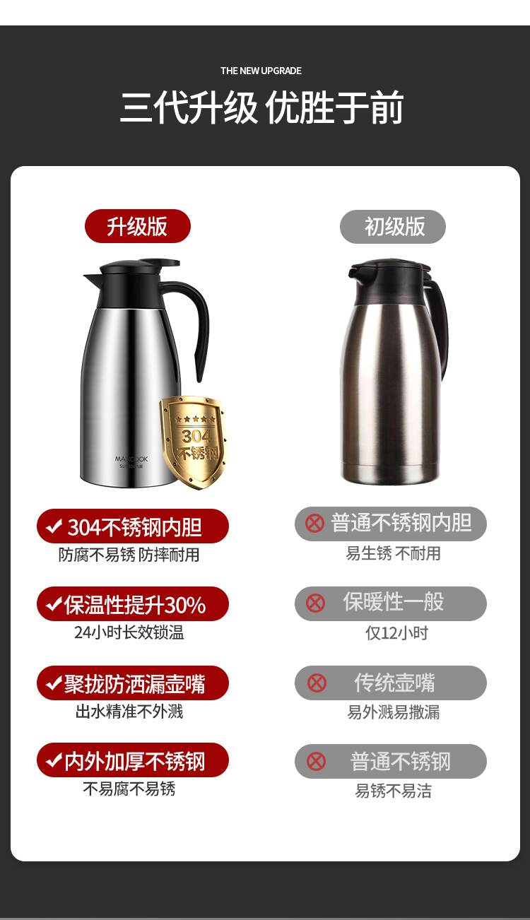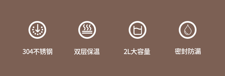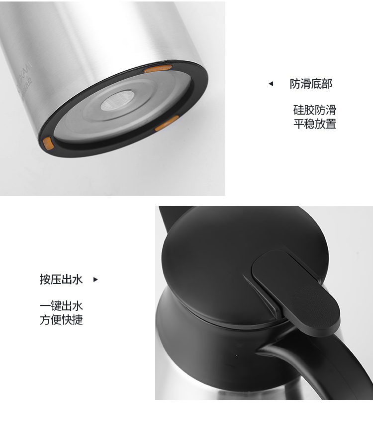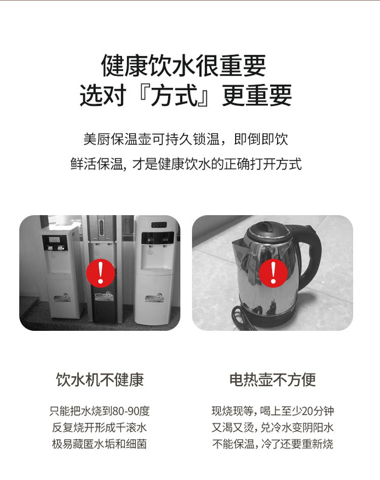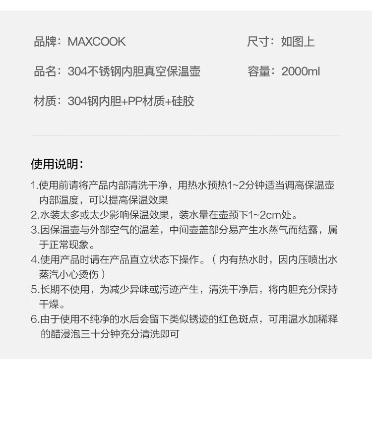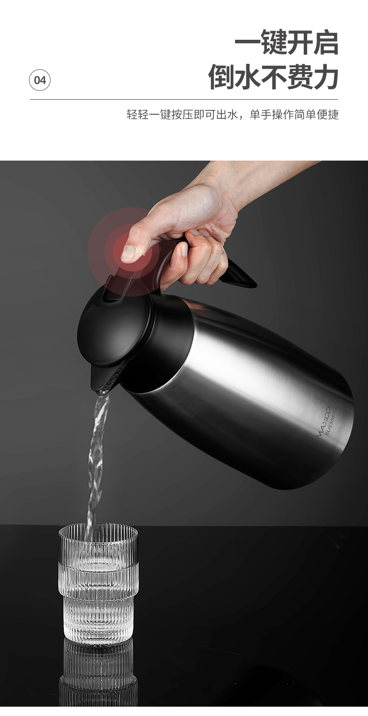 美厨304不锈钢真空保温壶水壶2L MCB390 不锈钢色