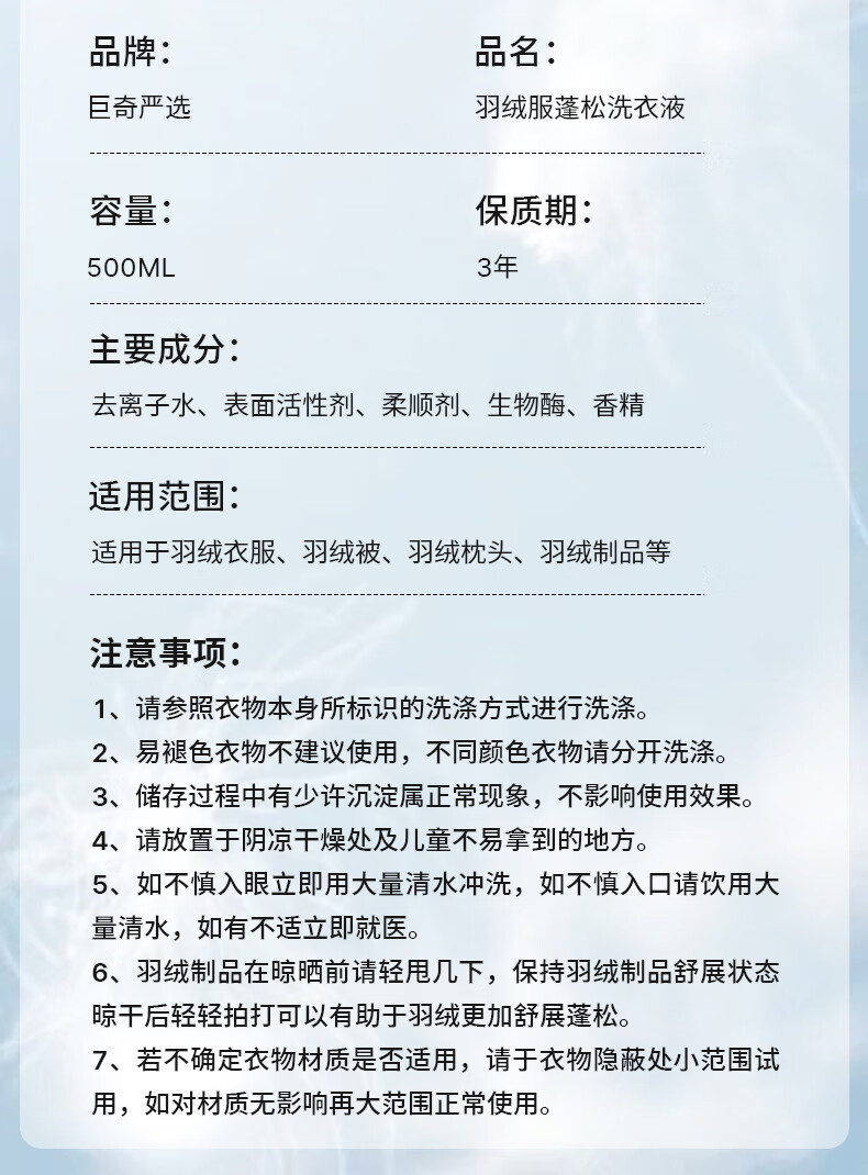 巨奇(JUQI) 羽绒服蓬松洗涤剂 500ml 去污去黄 白色(单位:瓶)