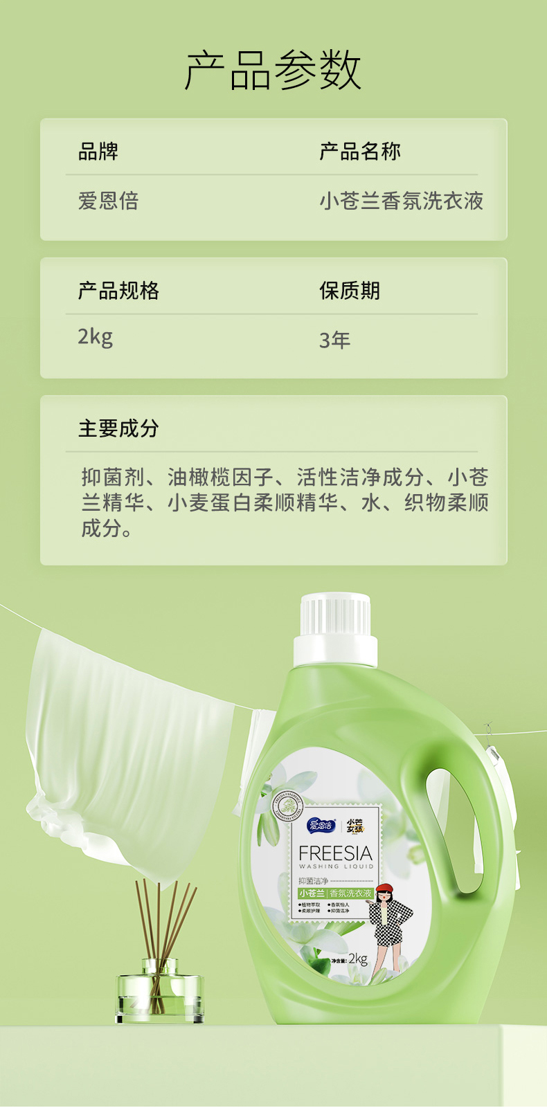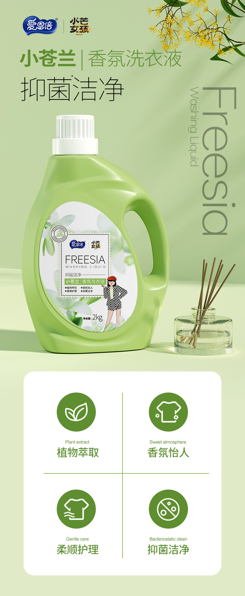 爱恩倍 4YDS-ANB412L 香氛洗衣液2kg*4桶 抑菌香氛洗衣液 松石绿(单位:组)