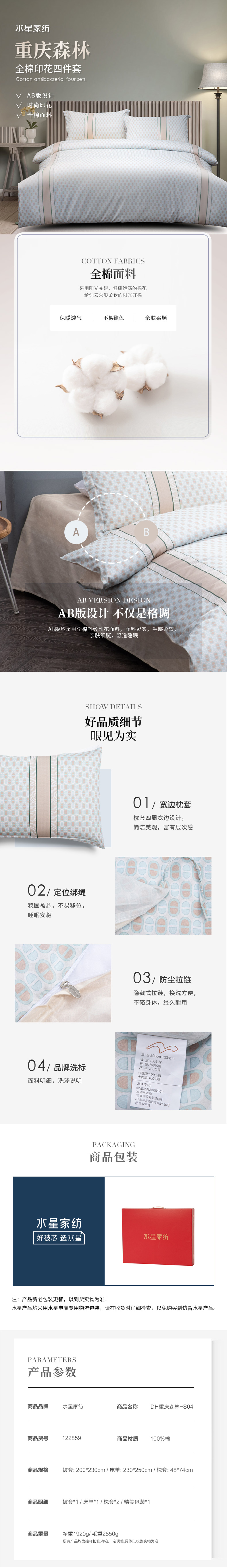 水星家纺 适用1.5米床四件套DH重庆森林 200cm×230cm/套(单位:套) 白色
