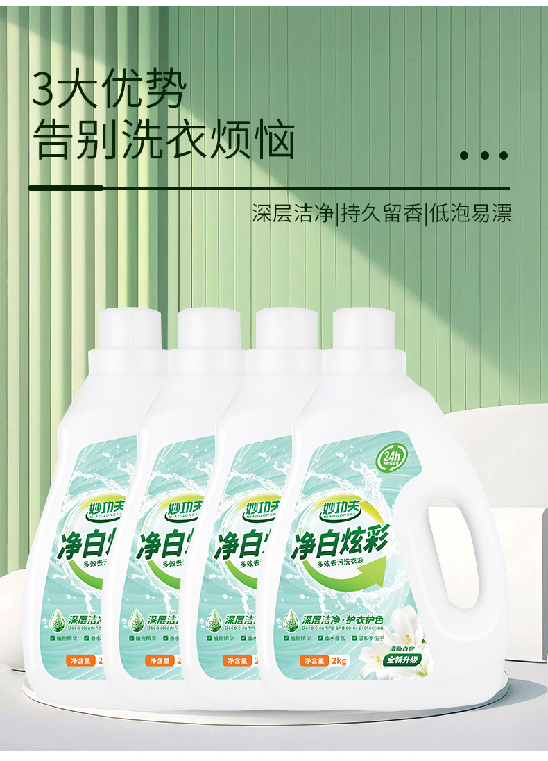 妙功夫 家清组合六件套 多效去污洗衣液2kg*4瓶+多功能清洁剂500ml*2瓶 天然花香持久留香 混色(单位:组)