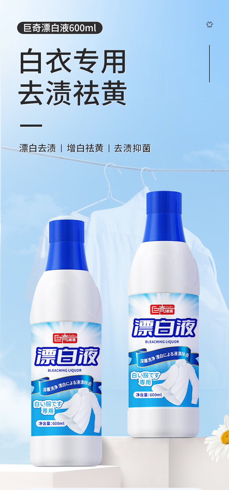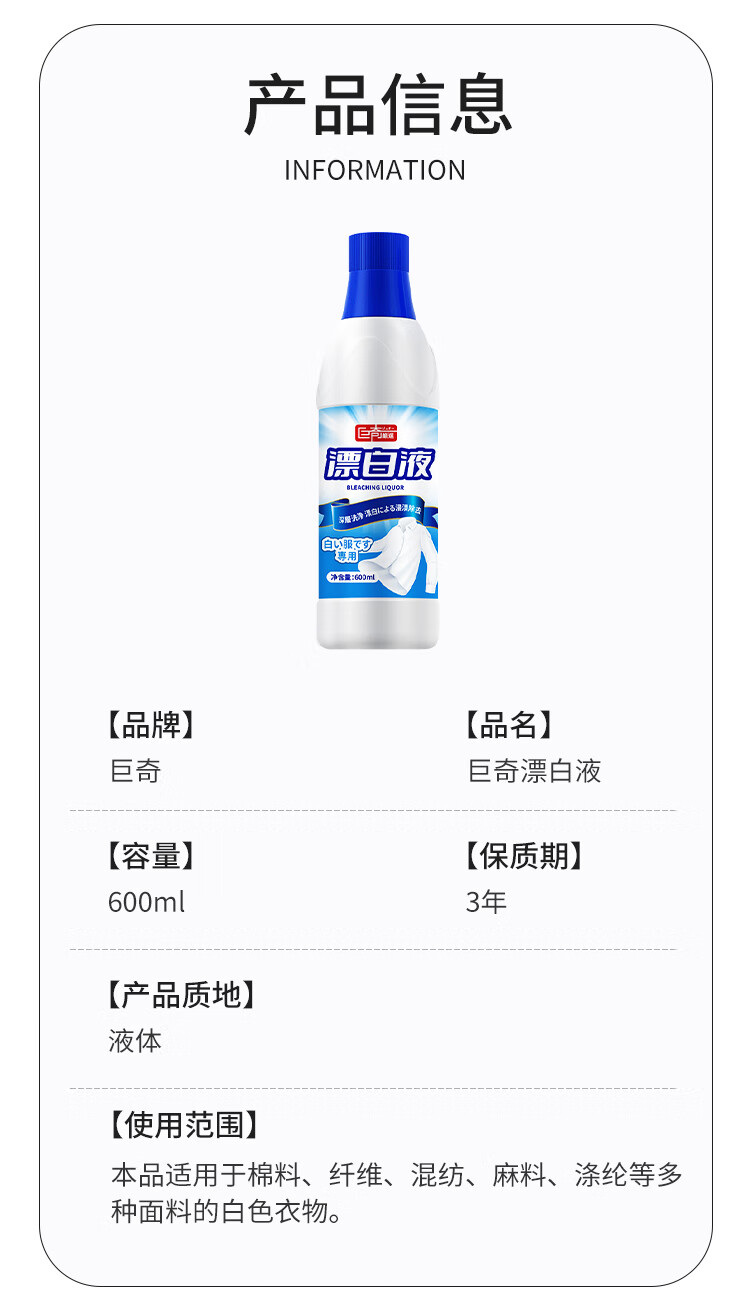 巨奇(JUQI) 漂白液 600ml 去黄增白抑菌 蓝色(单位:瓶)