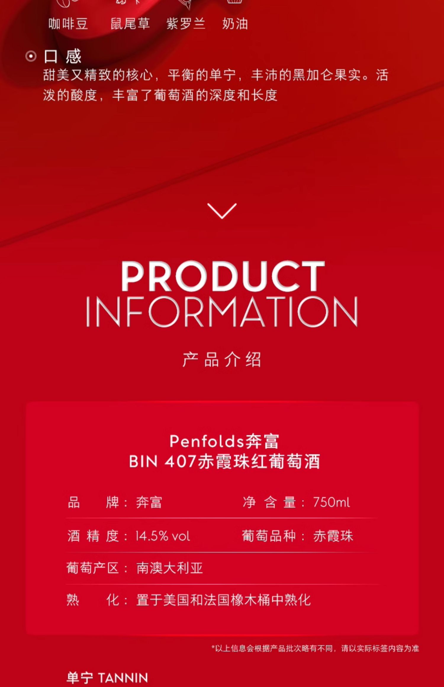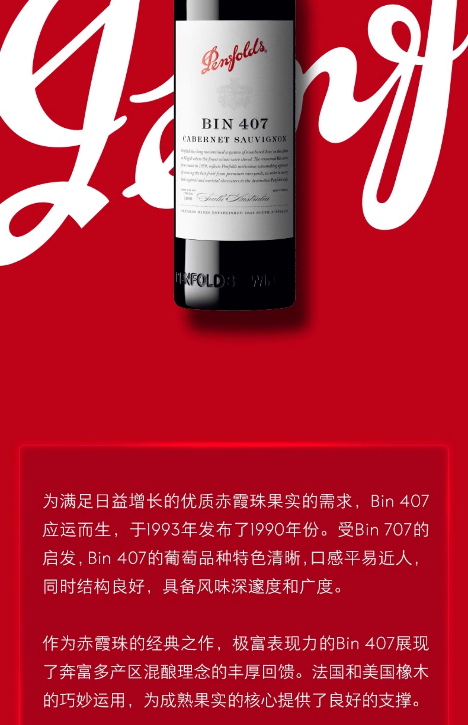 奔富 BIN 407赤霞珠 红葡萄酒 750ml*1 红色(单位:瓶)