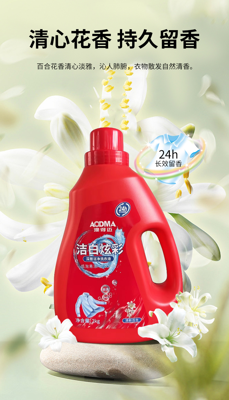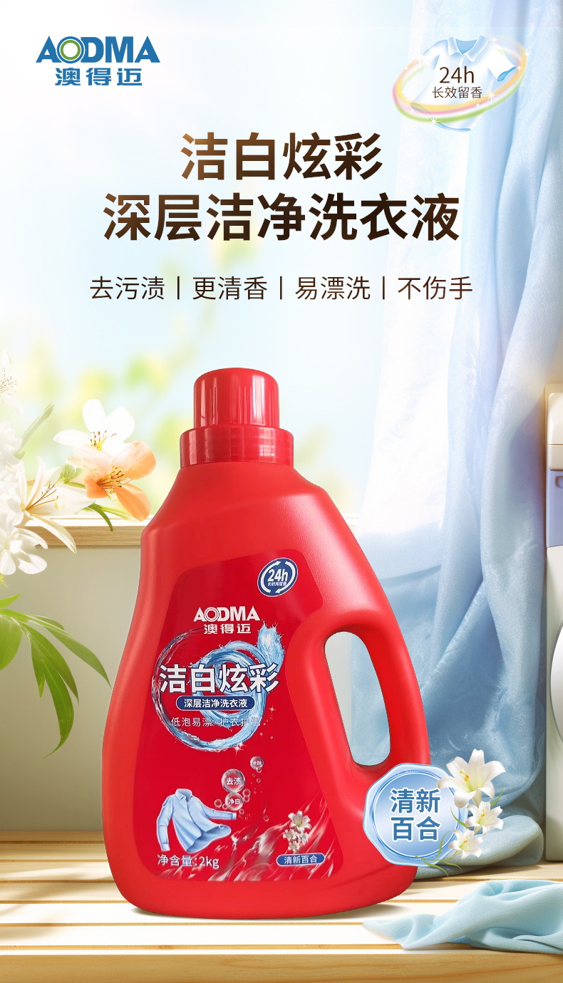 澳得迈(AODMA) 深层洁净洗衣液 有效祛除顽固污渍 持久留香 洁白炫彩 2kg 红色(单位:瓶)