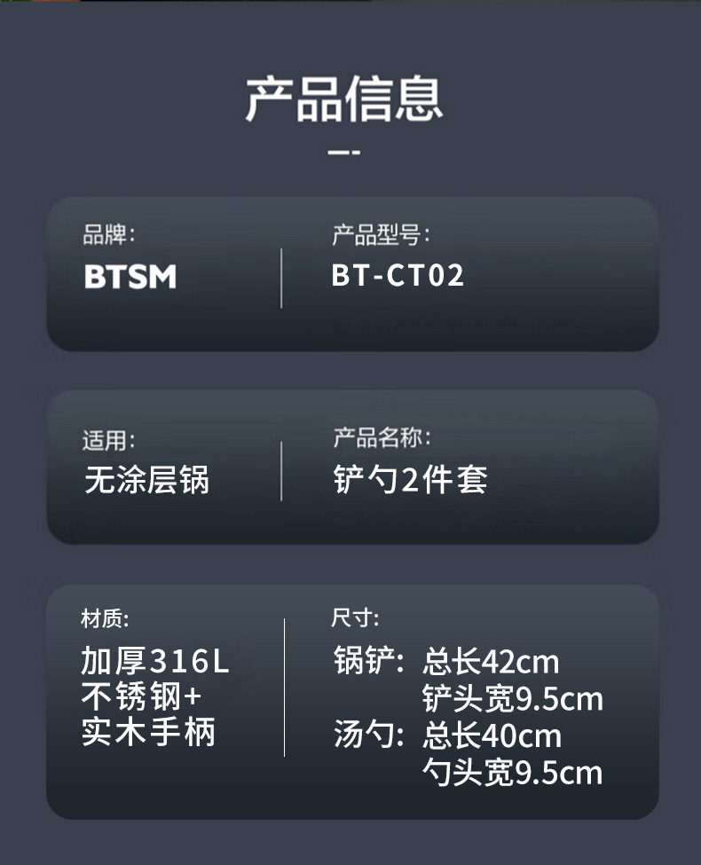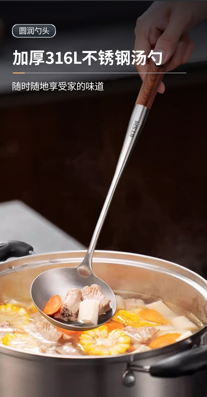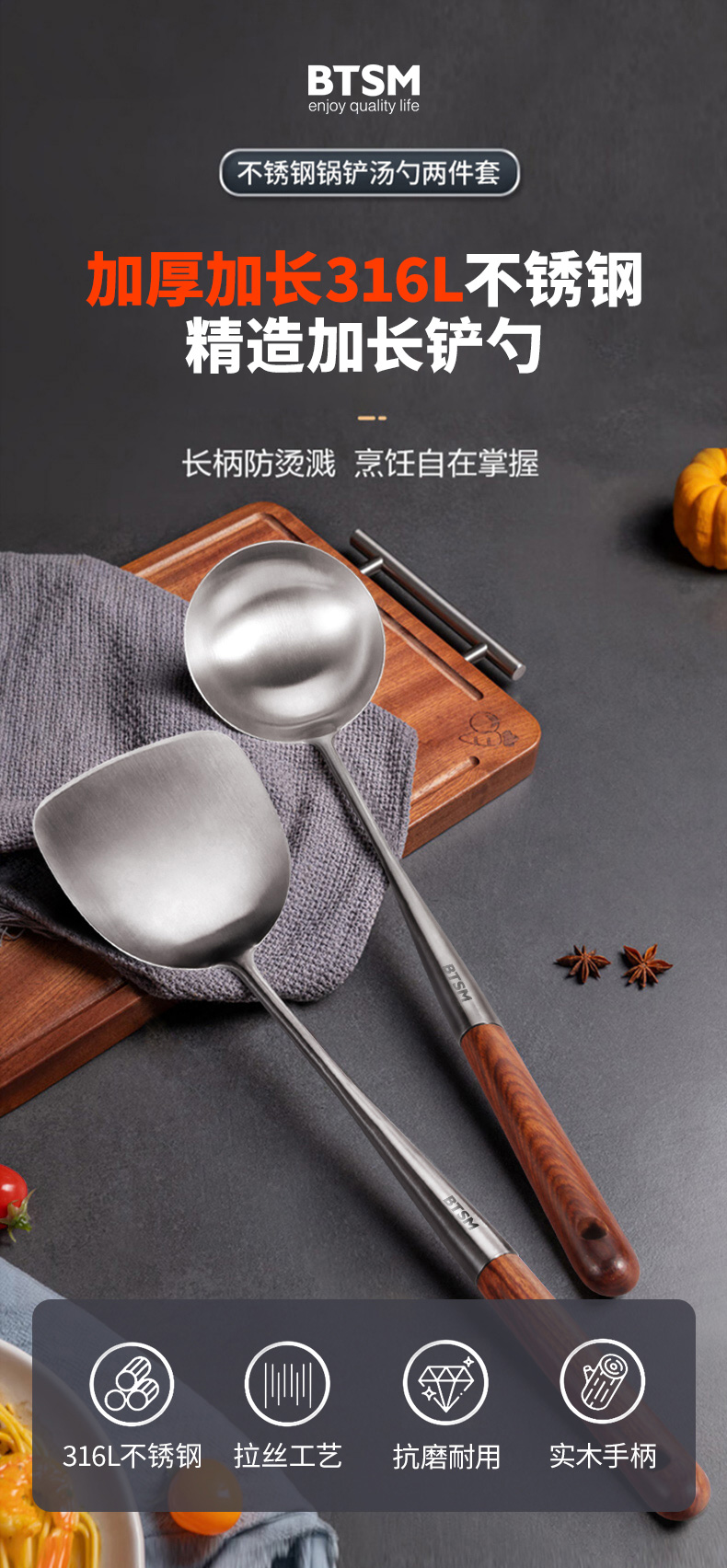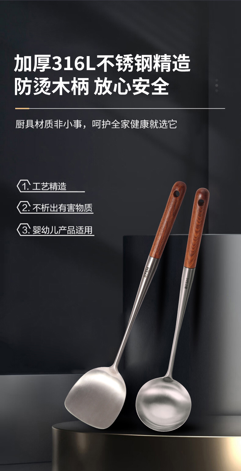 BTSM 加厚加长316L不锈钢铲勺 锅铲+汤勺 2件套 BT-CT02 产品净重:0.35kg 银色(单位:套)