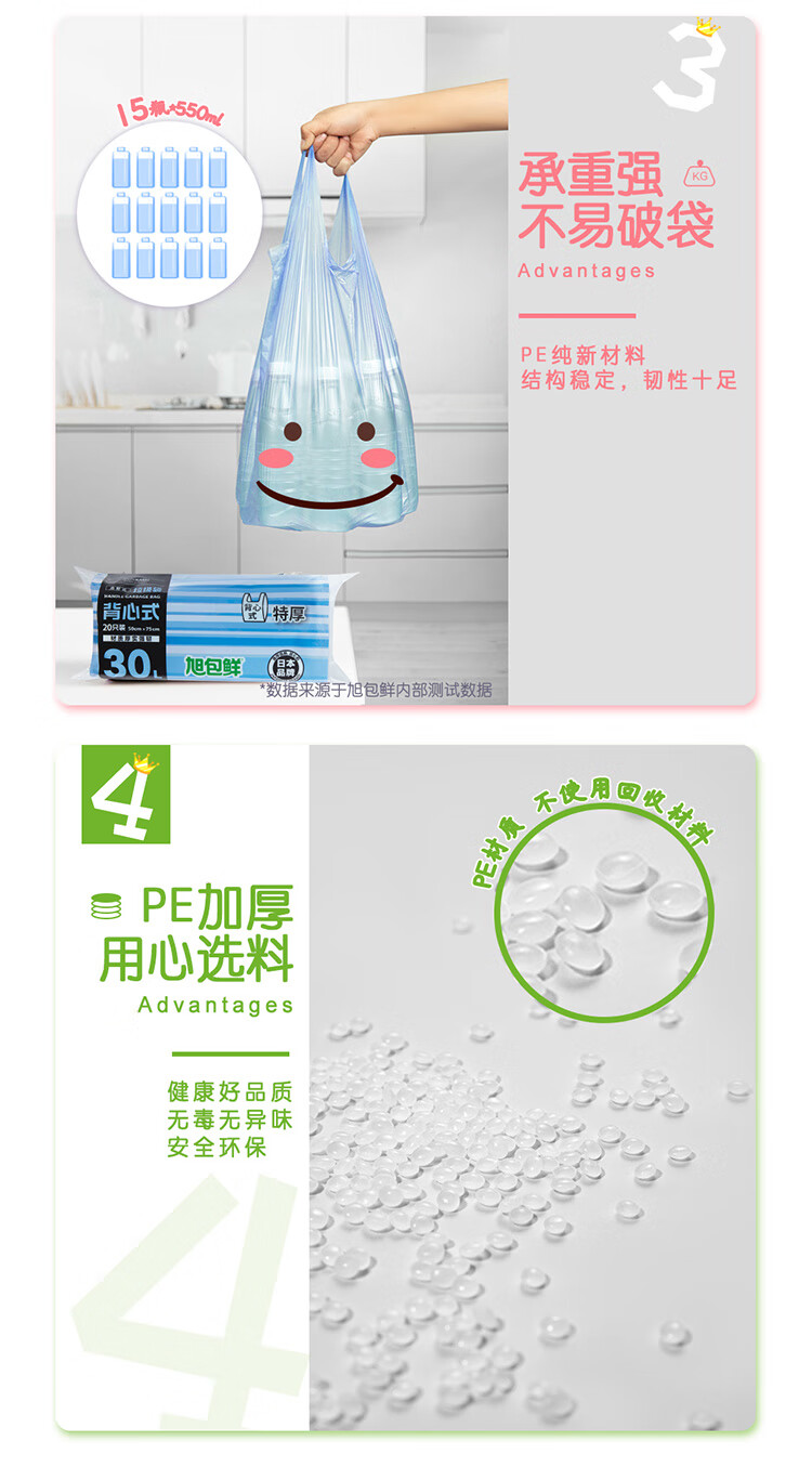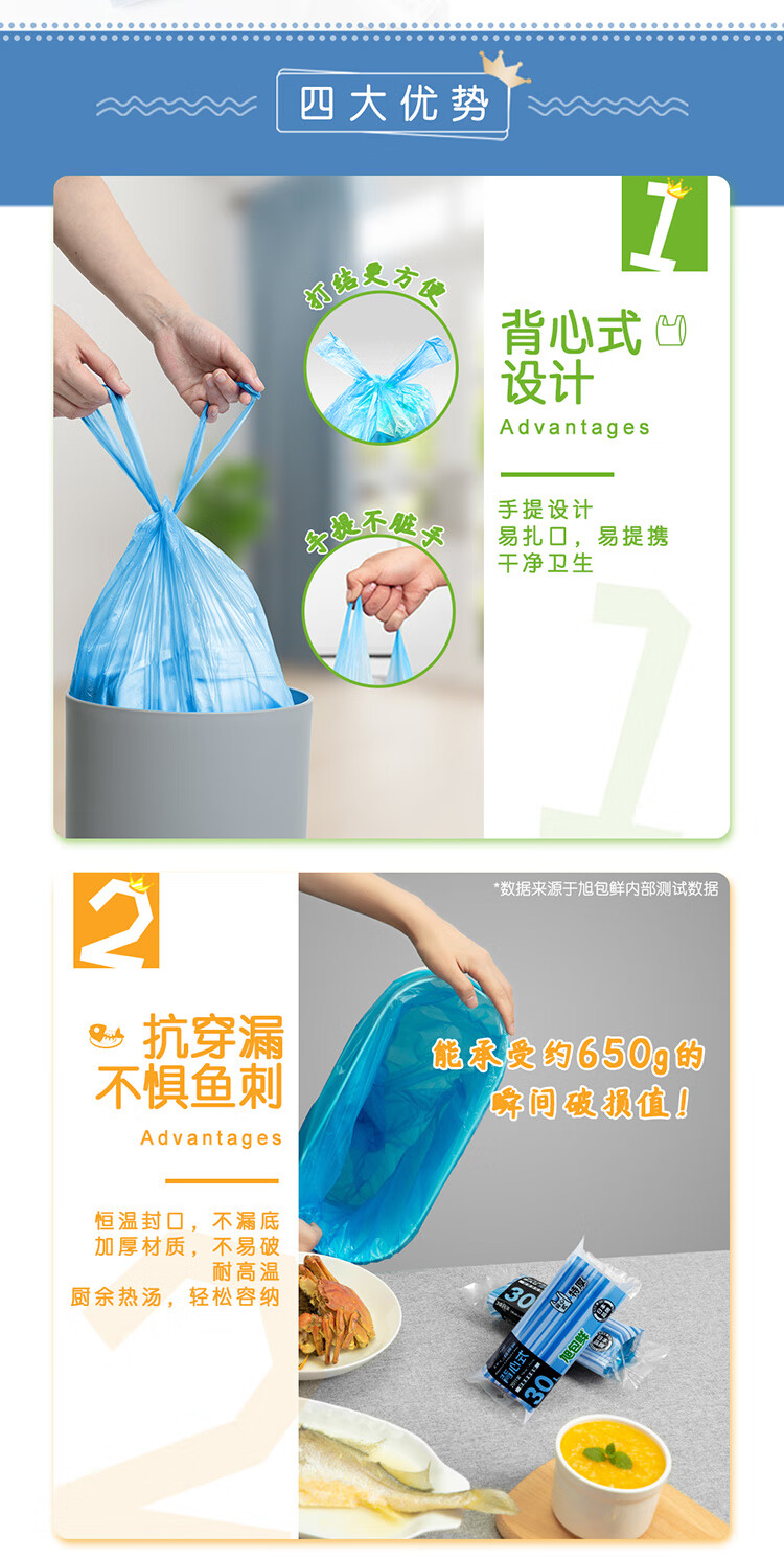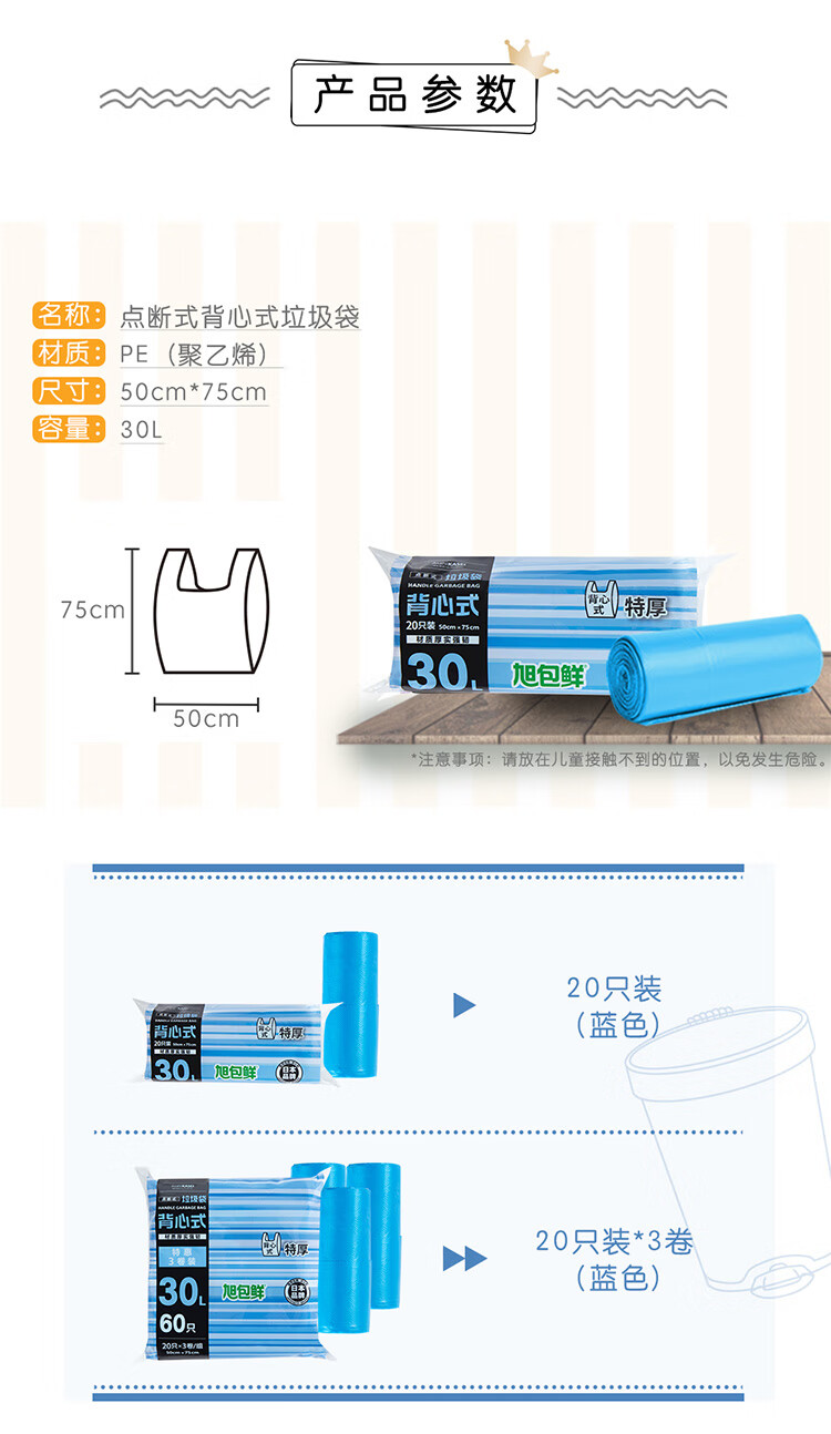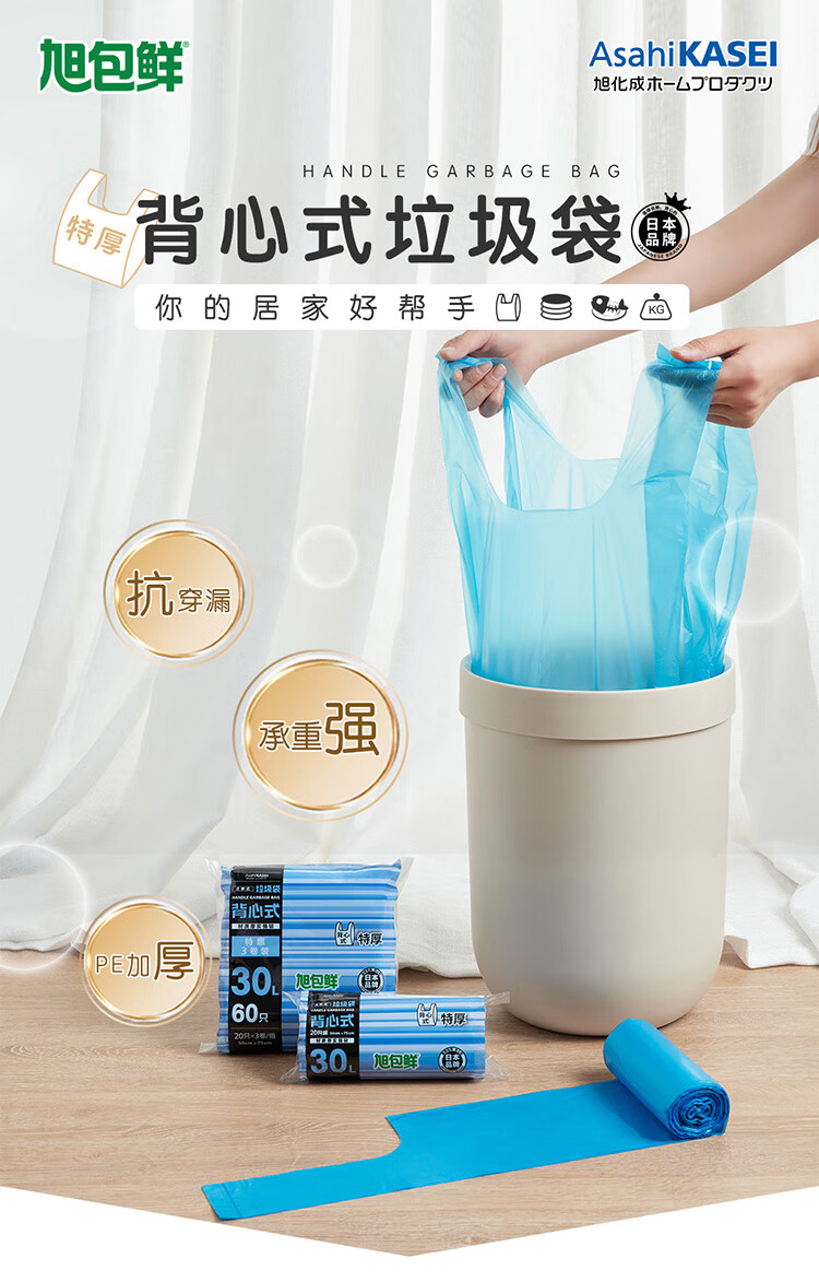 旭包鲜 ®30L背心式垃圾袋 50cm×75cm 3卷60只*3组(共180只) 蓝色(单位:组)
