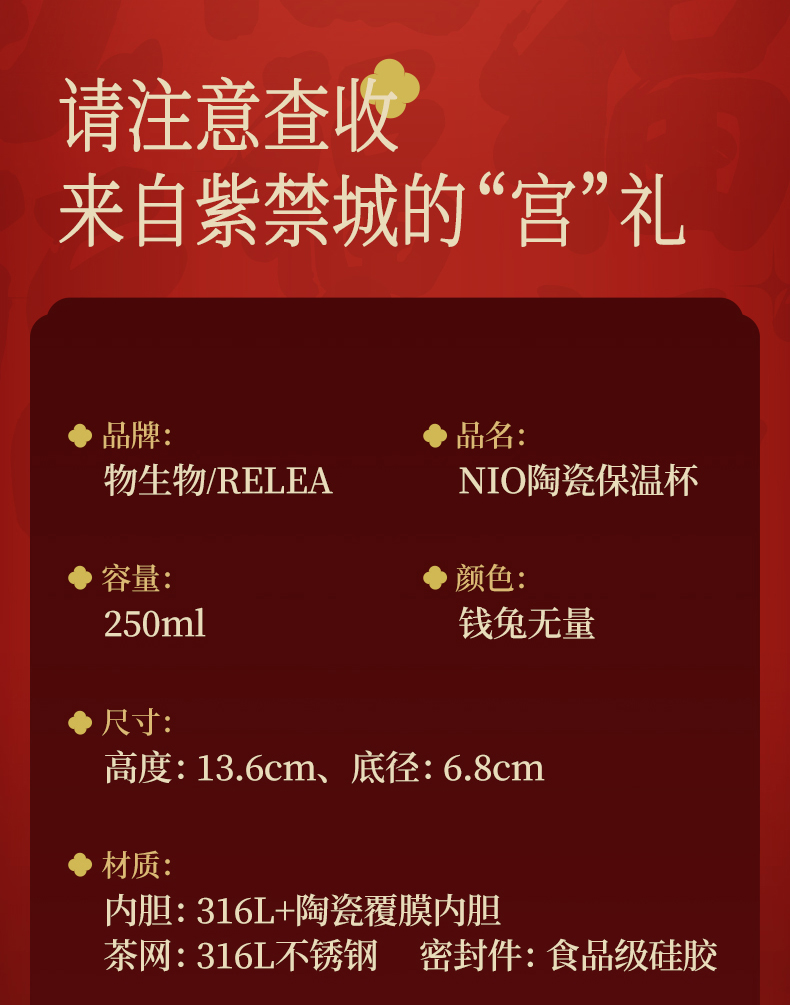 物生物(RELEA) Nio陶瓷保温杯 JV012535-0250-HS00 250ML 钱兔无量(单位:个)