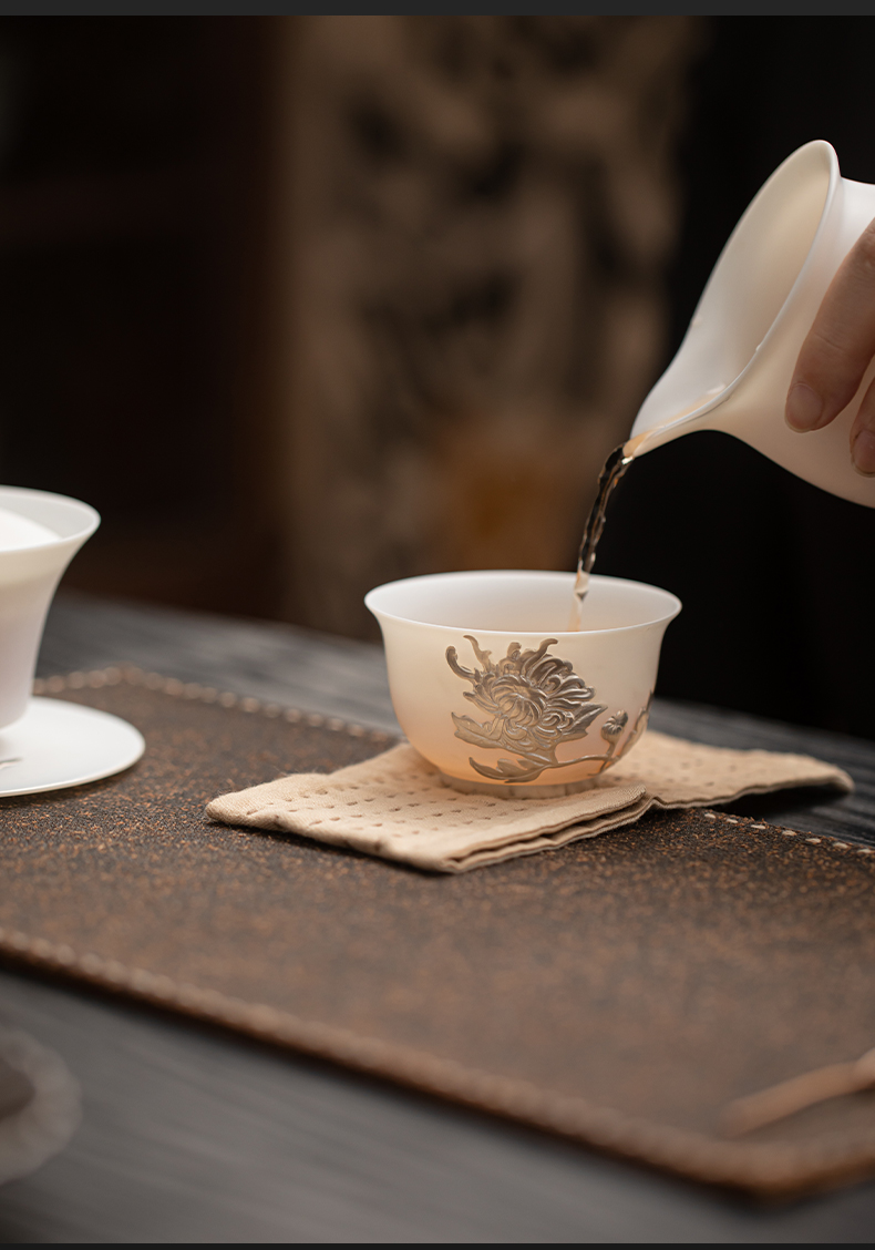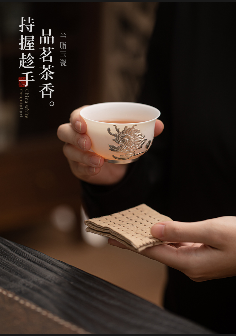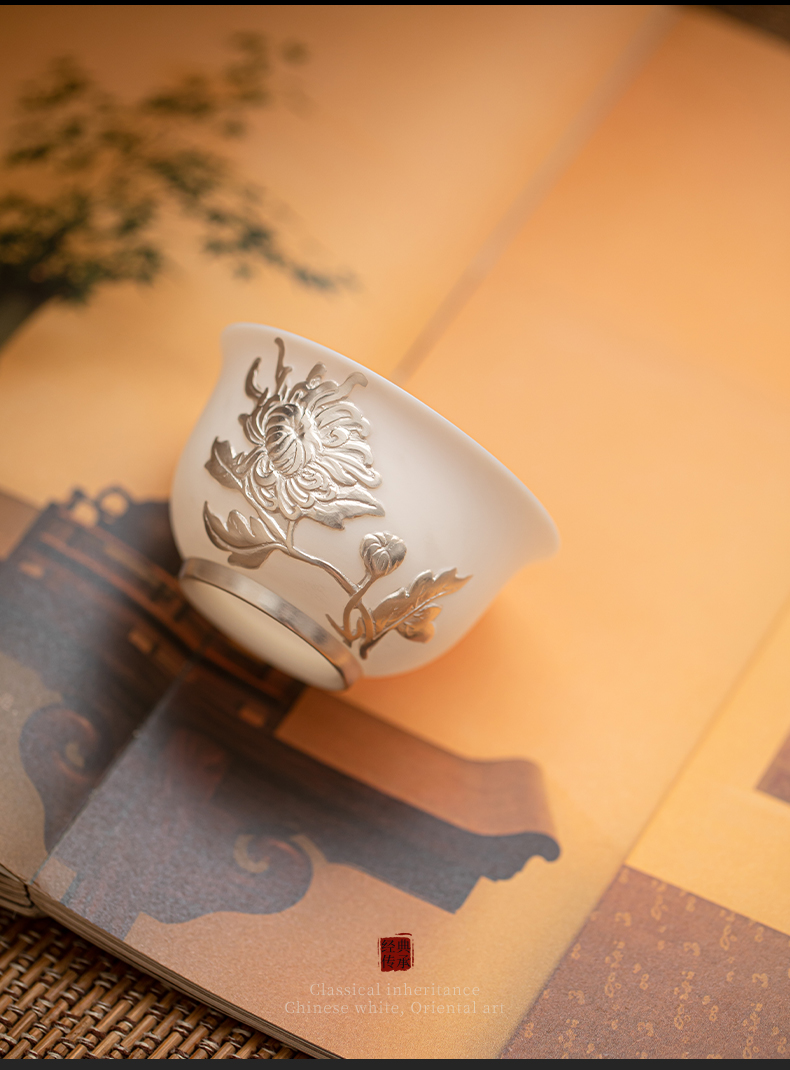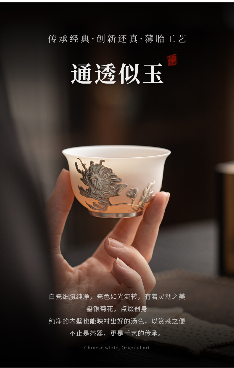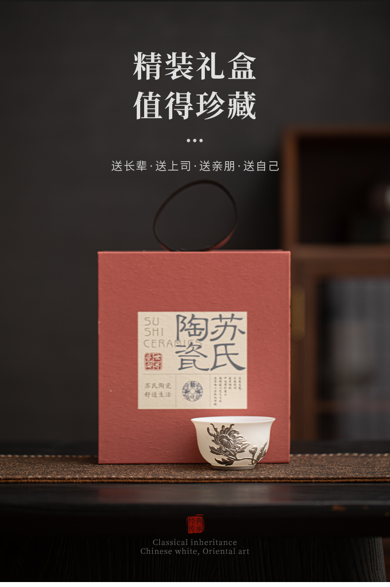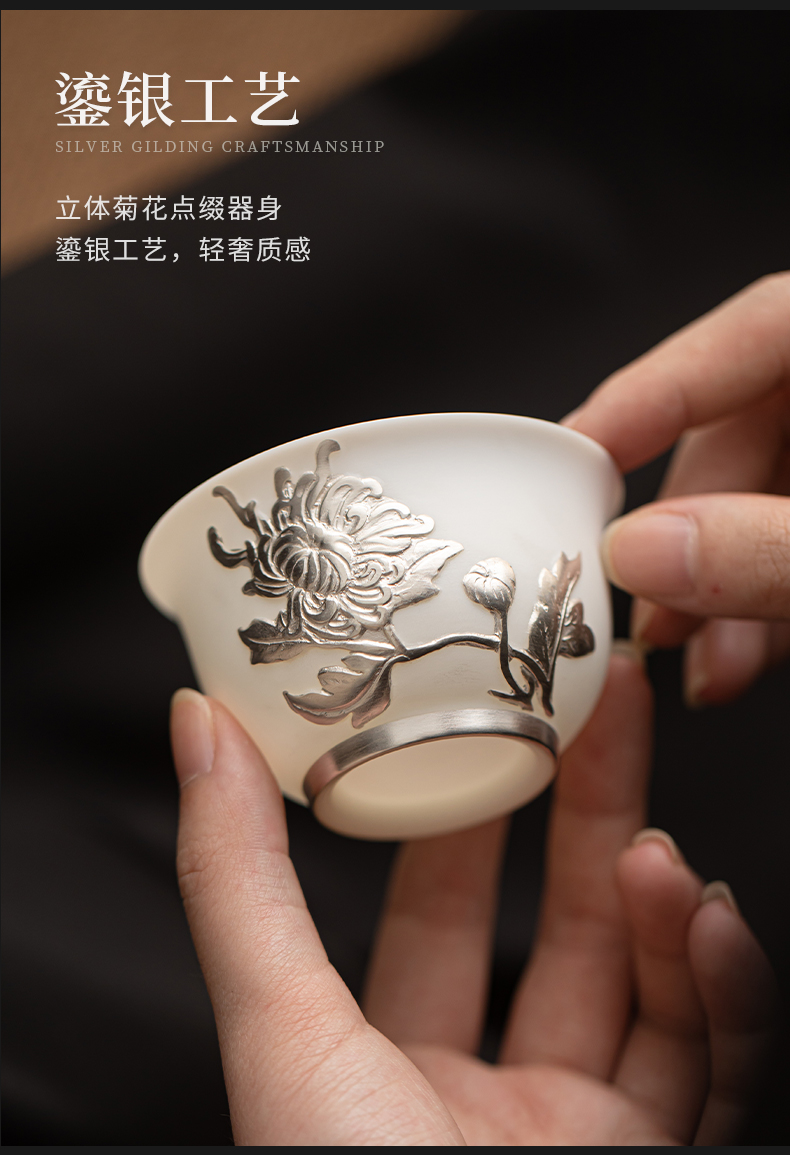 苏氏陶瓷(SUSHI CERAMICS) 玉瓷鎏银菊花主人杯 J1271 茶杯85ml*1 白色(单位:个)
