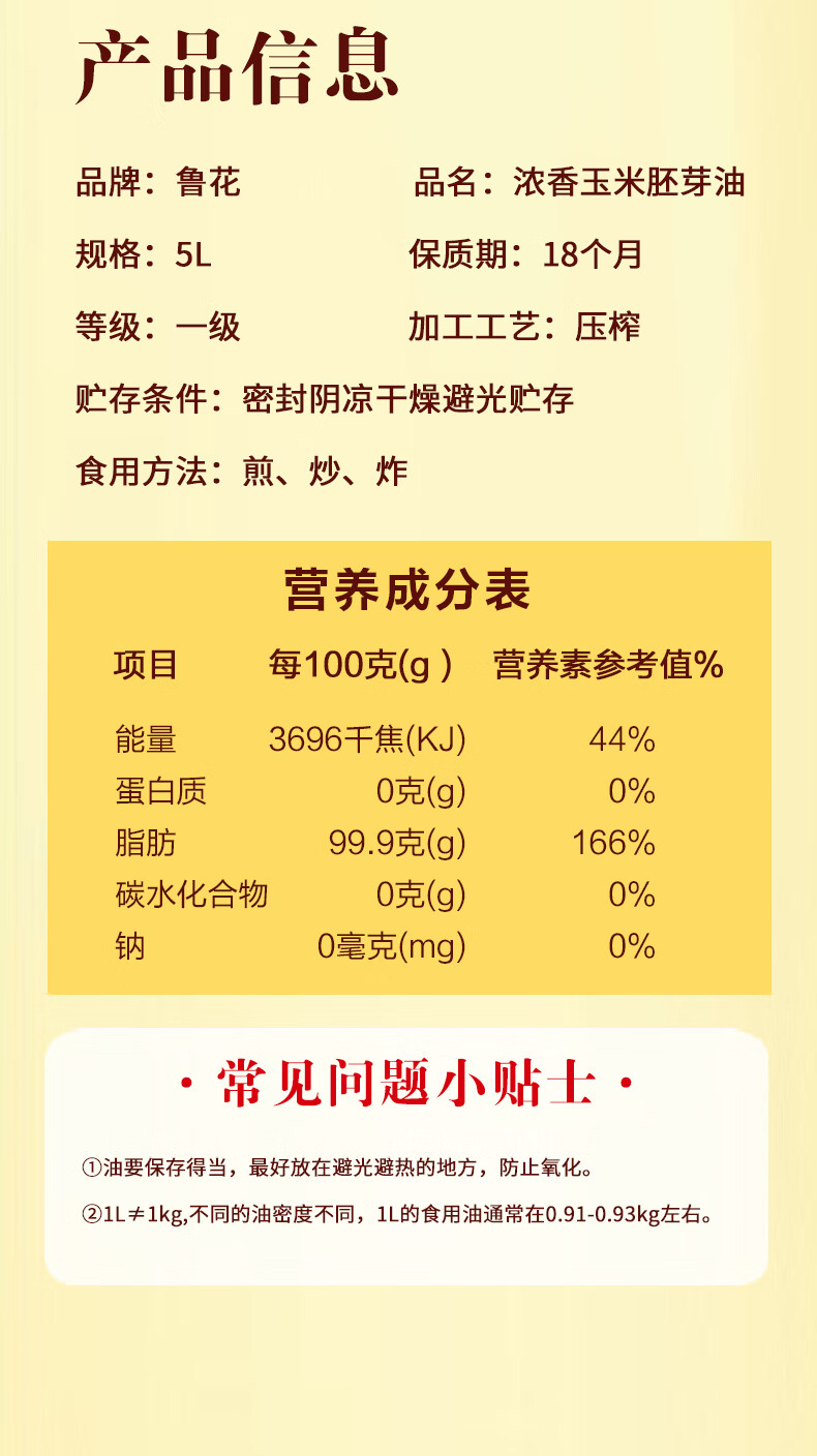 鲁花 浓香玉米胚芽油 非转基因 5L 黄色(单位:桶)