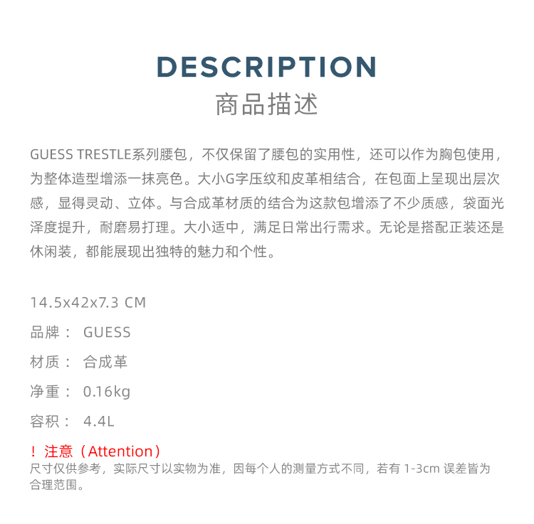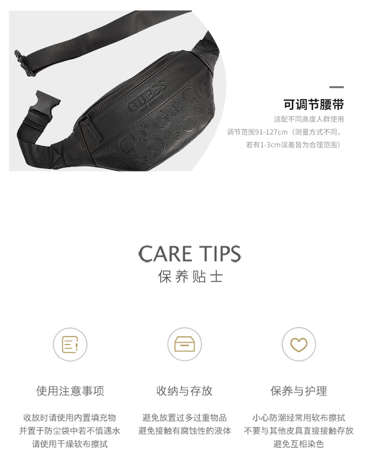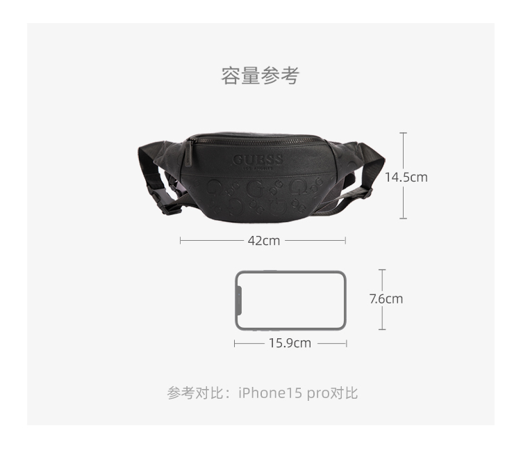 盖尔斯/GUESS TRESTLE腰包胸包 4.4L 1个 GSPLD882994STD 尺寸:145*420*73mm,净重:0.16KG 深灰色(单位:个)