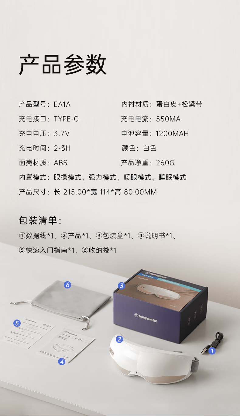 西屋(Westinghouse) 热敷眼睛眼部按摩器 WEN-EA1A 1200mAh 白色(单位:台)