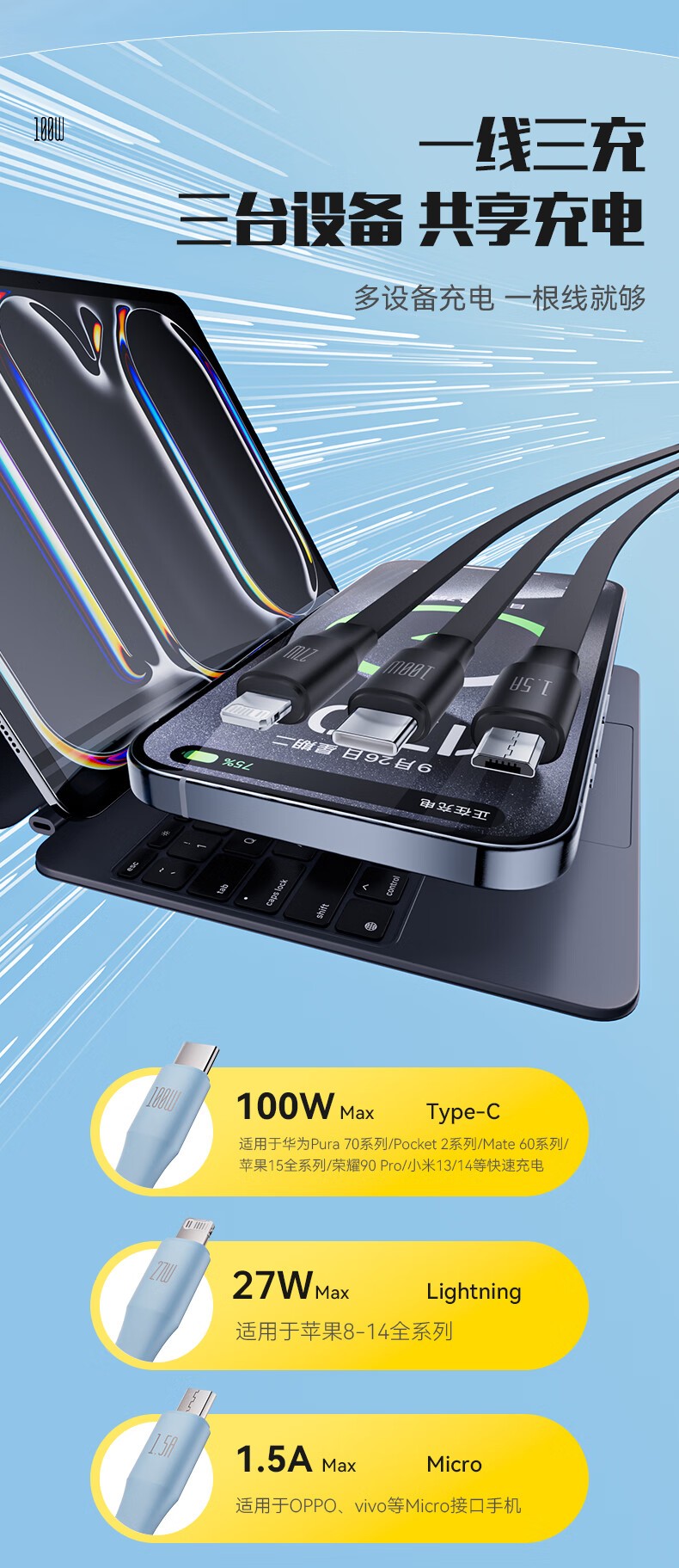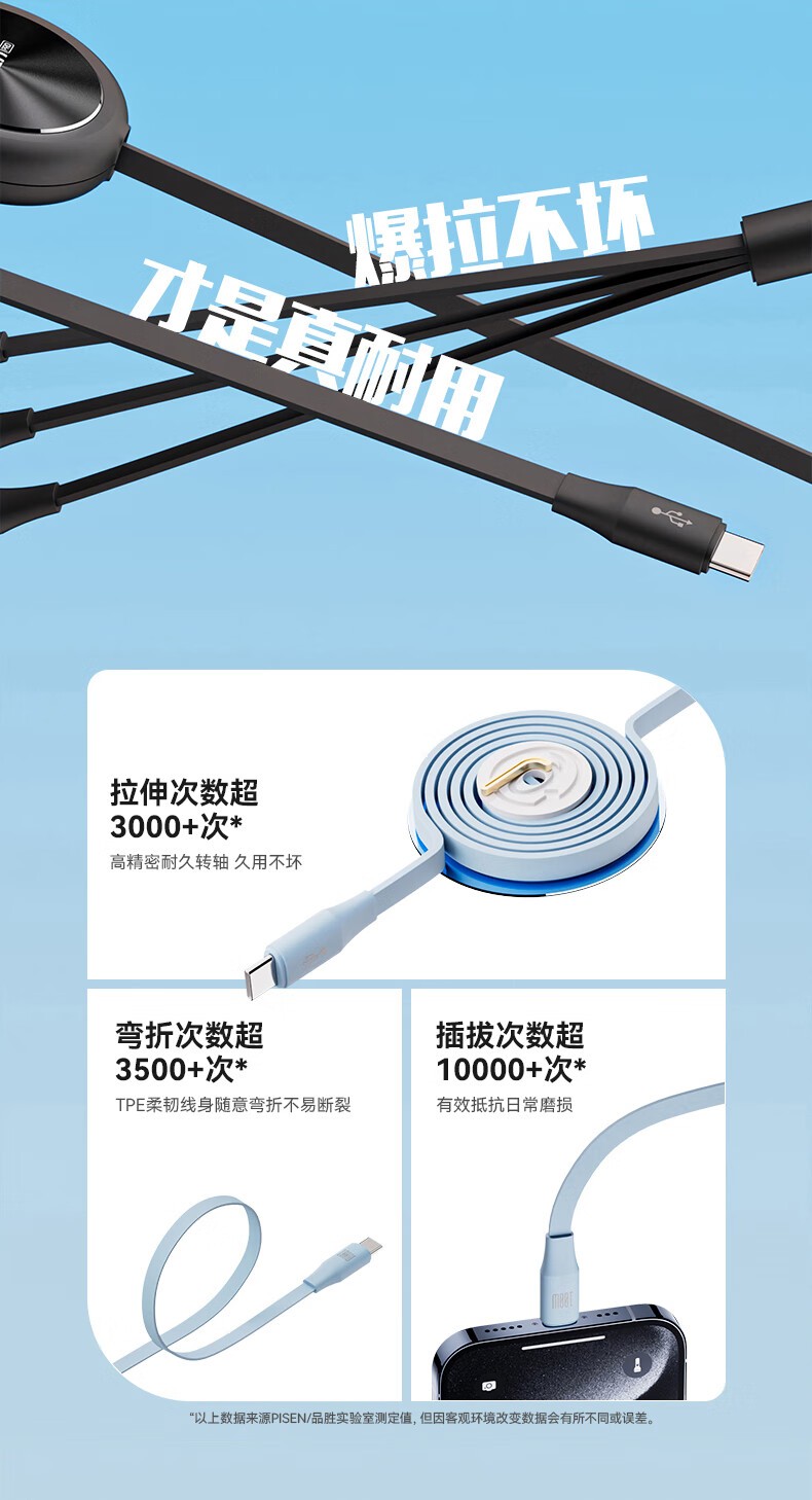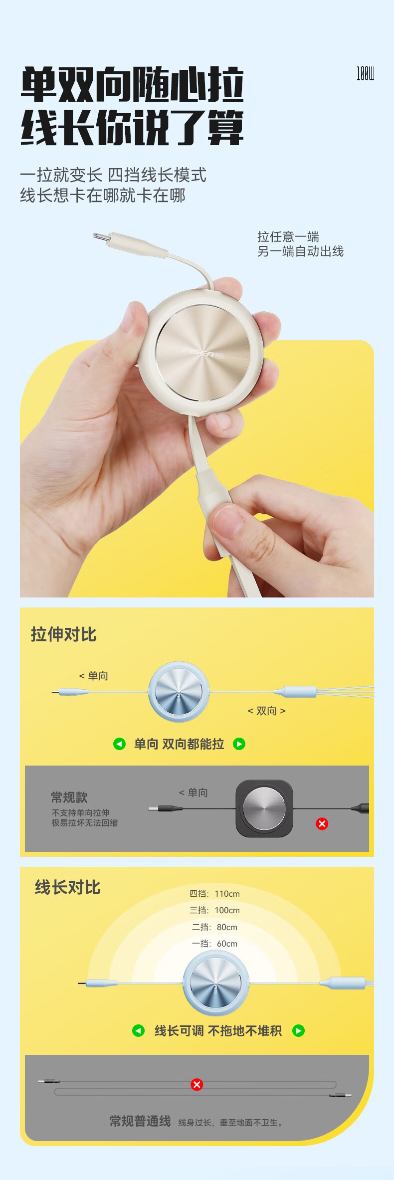 品胜(PISEN) PD100W 1.1米 一拖三拉伸充电线 白色(单位:条)