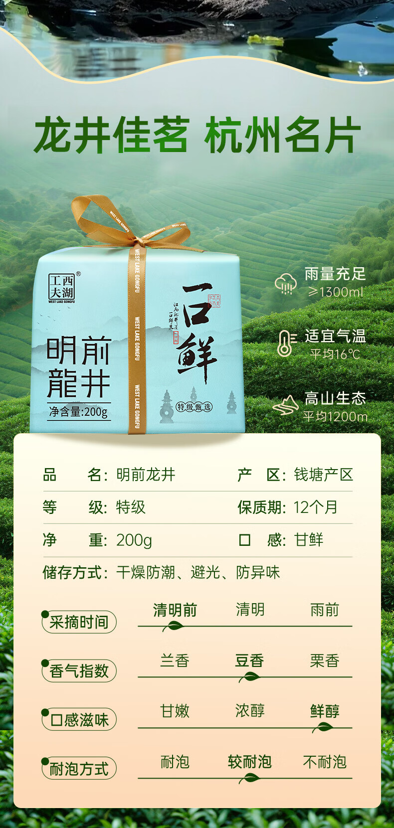 西湖工夫 特级AA 200g/盒*1 一口鲜明前龙井 天蓝色(单位:盒)